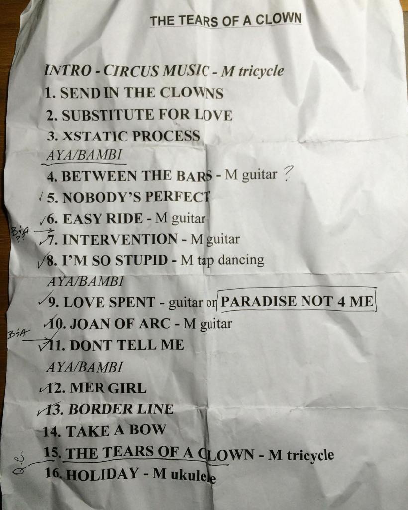 - El show tuvo una duración de casi 3 horas, finalizando cerca de las 3 de la madrugada y un total de 15 canciones. Practicamente todas en formato acústico o balada.