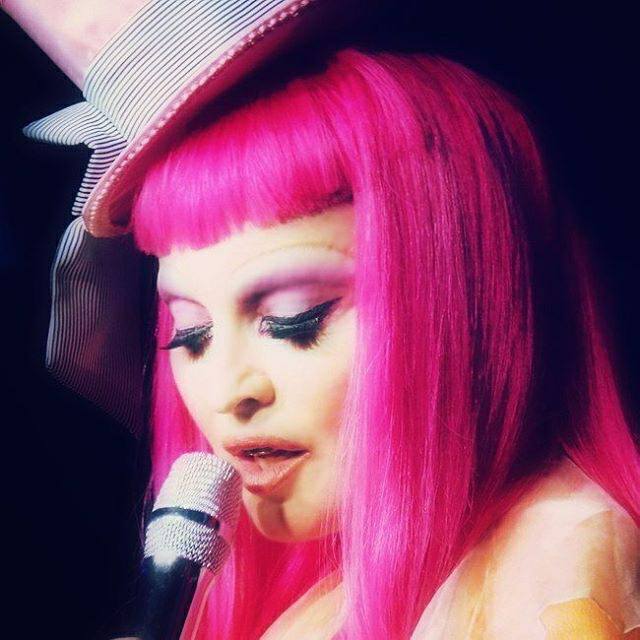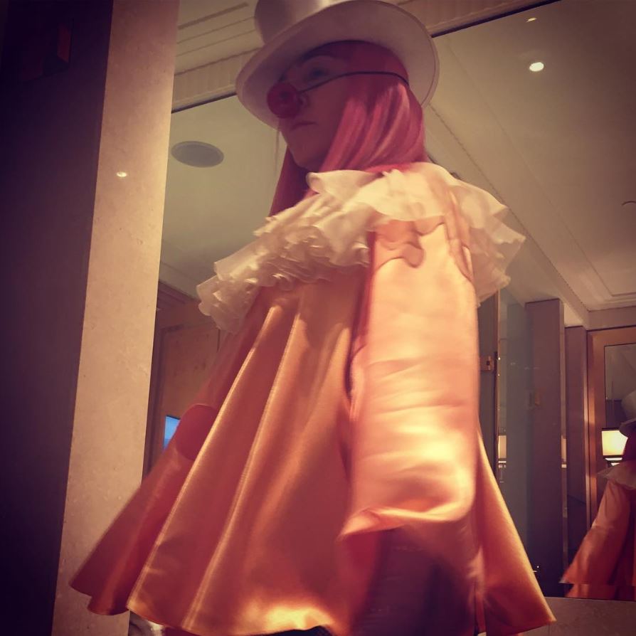 «Eso significaba cabellos lacios y puntas lisas. Eso desencadenó un frenesí de referencias, pizarras con anotaciones, colores, estilos, y formas que nos enviábamos el uno al otro hasta que a ella le gustaron algunas de mis ideas… Así es que con todas esas anotaciones me puse a diseñar y crear un conjunto de tonos de rosa usando diferentes fórmulas de Wella para colorear mis pelucas de cabello natural en muchas sombras de diferentes tonos de rosa. Llegó un punto en el que todo lo que tenía era rosa fuerte y púrpura encima mio, así es que quería meter las pelucas en agua y color para lograr un tono mas suave de rosa, pero no teníamos ni un balde ni una olla, pero Rob Sheppy inventó una caja cubierta con una bolsa para basura y usamos eso. El truco funcionó por que logré crear el mas hermoso tono rosa pálido que he visto».