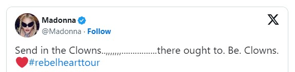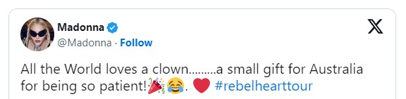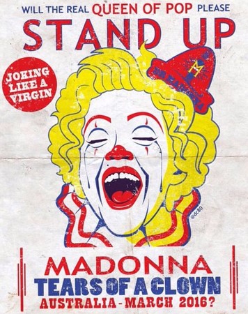 - Desde inicios del mes de marzo, Madonna había comenzado a compartir en su cuenta de Instagram y Twitter enigmáticos mensajes en donde hacía referencia a una «sorpresa» para Australia y a los «payasos». Mensajes como: «todo el mundo ama a los payasos… un pequeño regalo para Australia por ser tan pacientes…»; «Enviado a las nubes… tiene que haber payasos» y «Pose de payaso loco» fueron algunos de los crípticos mensajes que la Reina del pop había dejado para la especulación de sus fans australianos.