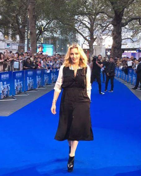 Acompañada por dos amigas, la cantante de 58 años recorrió la alfombra azul del cine «Odeon Leicester Square» con un vestido tipo universitario blanco y negro abotonado. Con su melena rubia suelta, Madonna complementó su look con aros dorados, una variedad de collares y un par de botines negros de Alaïa. «Simplemente perfecta», escribió ella en su cuenta de Instagram sobre la película después de su estreno. «Un recordatorio inspirador y aleccionador de esta banda genial». «Épico», escribió en otra publicación.
