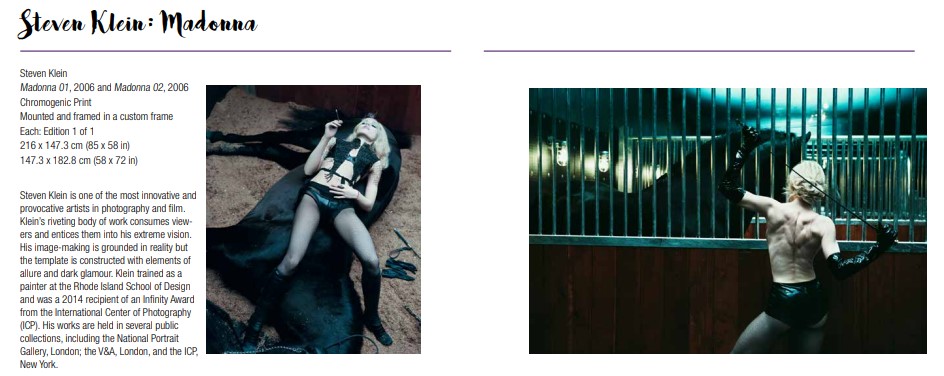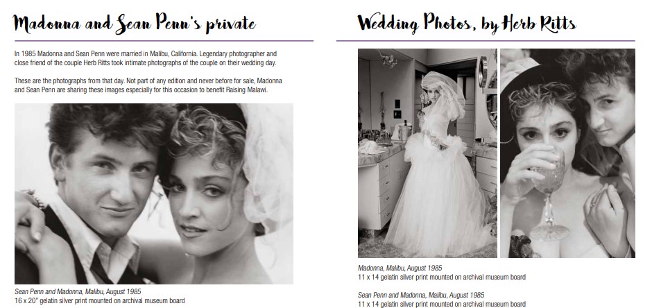 - Por último, se subastaron también las fotografías originales de la boda de Madonna y Sean Penn en 1985 tomadas por Herb Ritts y reproducciones originales de fotos de Steven Klein y las icónicas imágenes de Steven Meisel del libro «Sex».