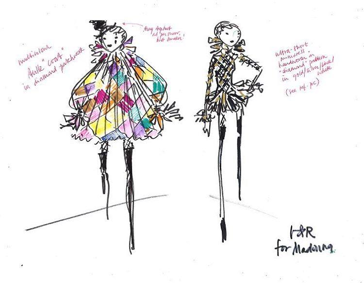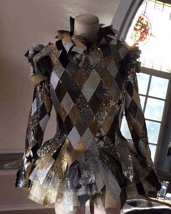 - Vestido corto al cuerpo con mangas largas compuesto por patrón de rombos en colores negro, blanco y dorado, también obra de Viktor and Rolf.