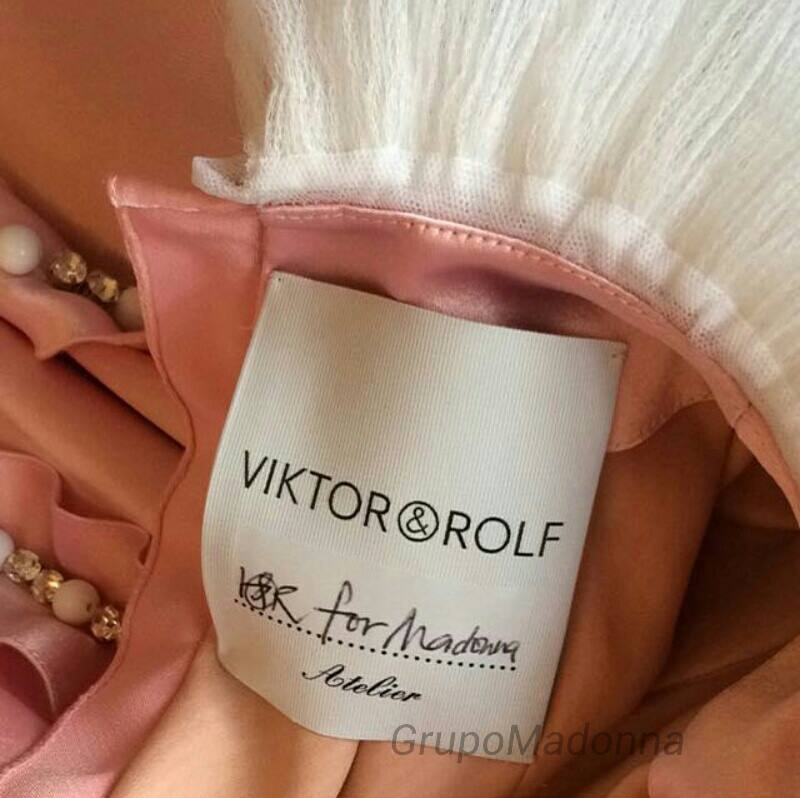 - Vestido de seda en color rosa con puños y cuello con capas y volados de microtul blanco, con aplicaciones de pedrería, cristales y perlas de los diseñadores Viktor and Rolf.