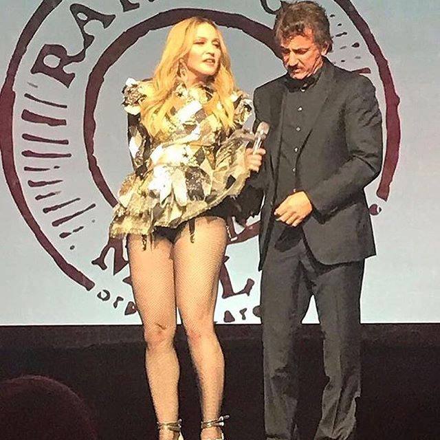 Madonna estuvo fuera durante la primera mitad de la subasta; luego volvió al escenario con Sean Penn para ayudar a vender las fotos de su boda de Herb Ritts. Él puso las esposas a Madonna y estuvieron muy juguetones juntos contando historias del día en que se casaron.