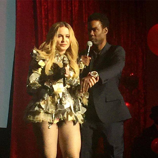 Chris Rock se acercó, contó algunos chistes y ayudó a vender un reloj y la partida de póquer con Ed Norton y Jonah Hill. Más tarde, Arianna Grande salió con el vestido de Swarovski de la gira «The Rebel Heart Tour» y bailó junto a Madonna y Sean Penn terminó comprando el vestido, superando a Arianna, que también estaba pujando.
