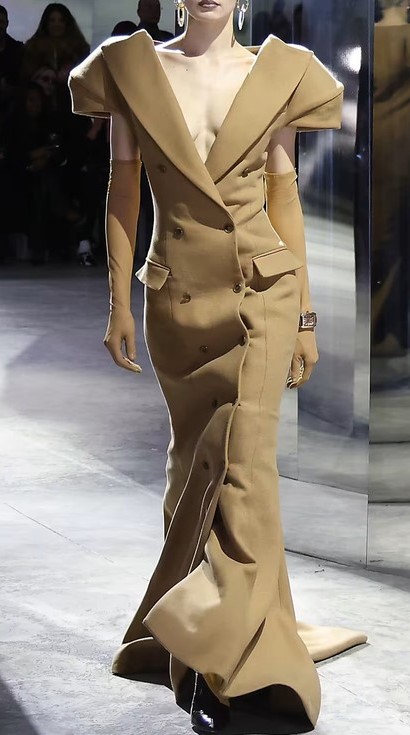 - Abrigo-vestido cruzado de lana en color camel con hombreras estructurales inspiradas en los «quarterbacks», de la colección otoño-invierno 2023 de «Luar».