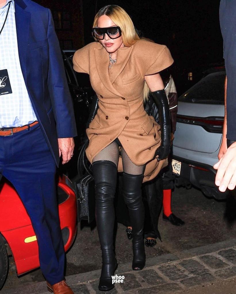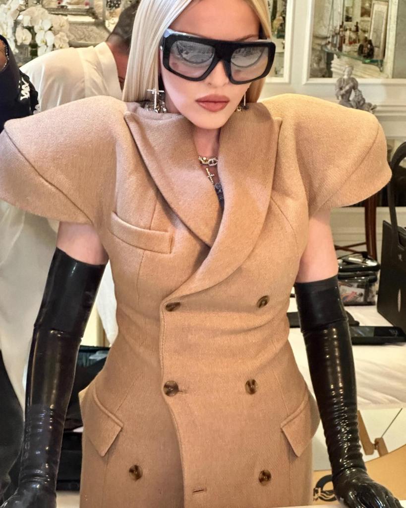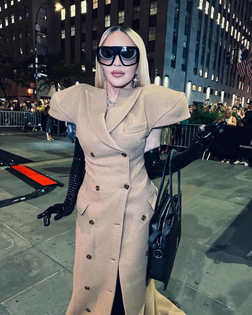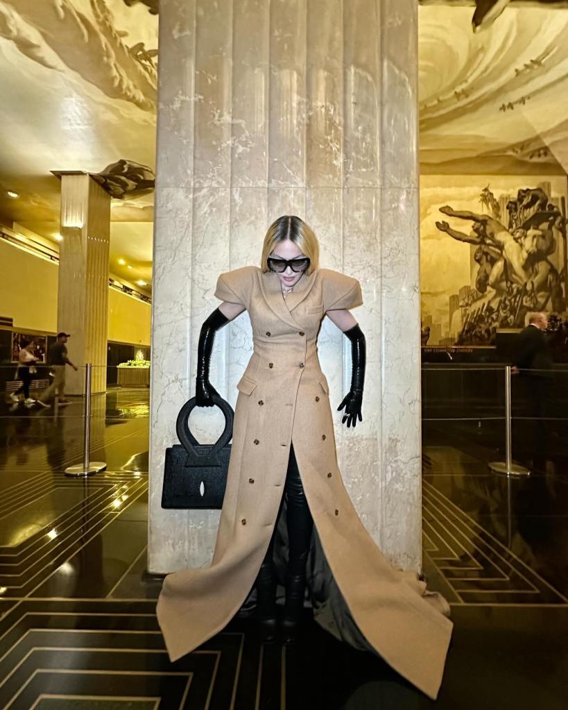 Madonna se preparó en su mansión del Upper East Side luciendo un estilo haciendo honor completamente a la marca que iba a presenciar con un vestido largo color camel y amplias hombreras armadas, gafas, guantes y botas larguísimas y ajustadas. La Divina no dejó oportunidad de tomarse algunas fotos antes de salir al evento.