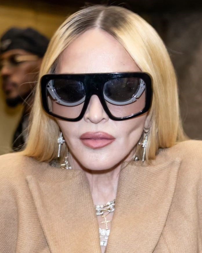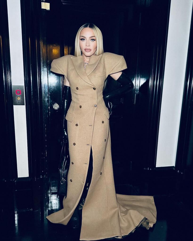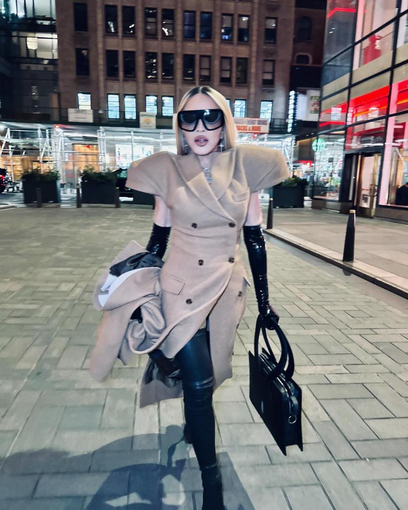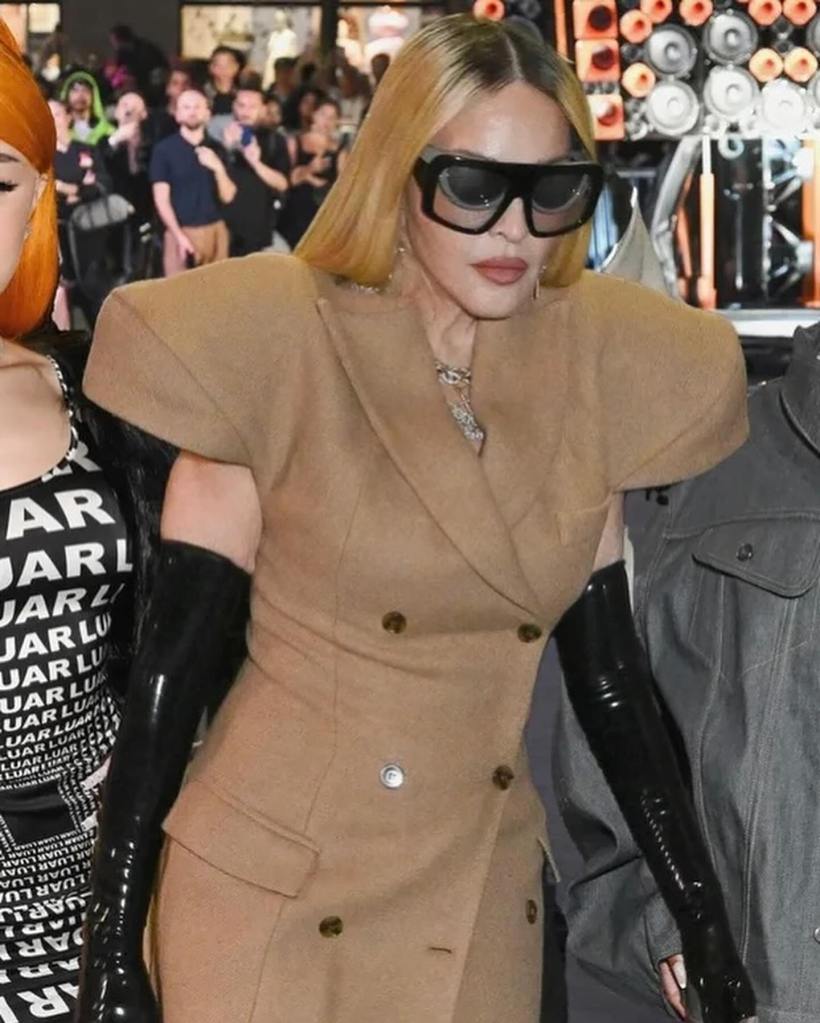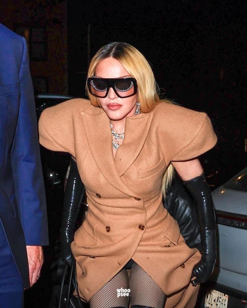 Madonna se preparó en su mansión del Upper East Side luciendo un estilo haciendo honor completamente a la marca que iba a presenciar con un vestido largo color camel y amplias hombreras armadas, gafas, guantes y botas larguísimas y ajustadas. La Divina no dejó oportunidad de tomarse algunas fotos antes de salir al evento.