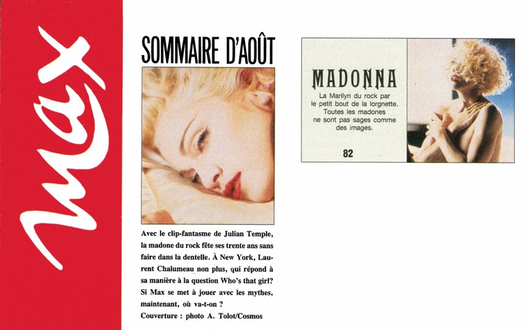 MAGAZINES ON THE COVER: «MAX» (FRANCIA) – AGOSTO 1989 por Divina Madonna25 \25\+00:00 septiembre, 2024 Comentarios 0 REVISTA: «Max» PAÍS: Francia FECHA: Agosto 1989 FOTOS: Alberto Tolot TÍTULO: «Madonna: Nos Versets Sacrileges» AUTOR: Laurent Chalumeau TEMÁTICA: carrera; vida personal PÁGINAS: 09 + póster Comparte esto: Comparte en Facebook (Se abre en una ventana nueva) Facebook Compartir en X (Se abre en una ventana nueva) X Haz clic en Pinterest (Se abre en una ventana nueva) Pinterest Compartir en Tumblr (Se abre en una ventana nueva) Tumblr Me gusta Cargando... 0 comments on “ON THE COVER: «MAX» (FRANCIA) – AGOSTO 1989” Deja un comentario Cancelar la respuesta Navegación de entradas Entrada anterior Entrada siguiente