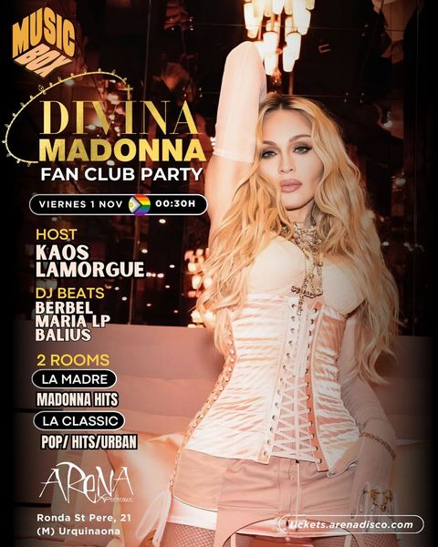 ¡Vive la magia de Madonna en «Arena Experience», en colaboración con Divinamadonna en una noche llena de música, baile y glamour dedicada a ella!. No dejes escapar esta oportunidad de reunirnos todos los fans de hoy y de siempre y cerrar con broche de oro, con actuaciones a cargo de @kaos_lamorgue & @charlottebishhh y el dúo de bailarines @twins.leon. Además sorteos de varios corpóreos de la Reina del Pop a tamaño natural y muchas más sorpresas.