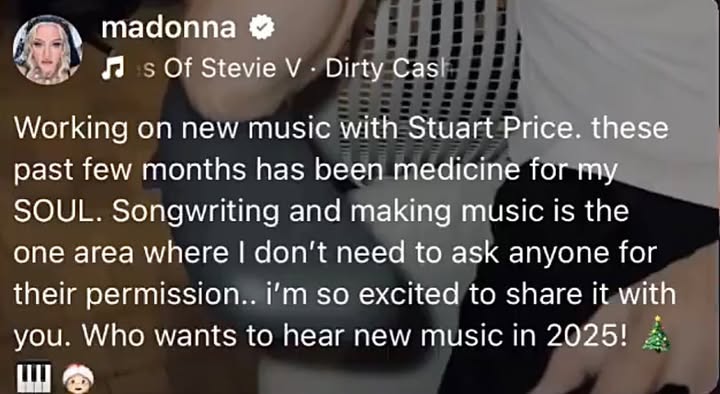 Por el momento, no hay mucha más información al respecto, solo nos resta esperar y ver que se nos trae entre manos la Divina para este 2025. En sus redes, Madonna escribió: «Hemos estado trabajando en nueva música y esto le ha ido muy bien a mi alma. Escribir canciones y componer es donde me siento más a gusto y no tengo que pedir permiso a nadie. ¿Quién quiere nueva música para 2025?».
