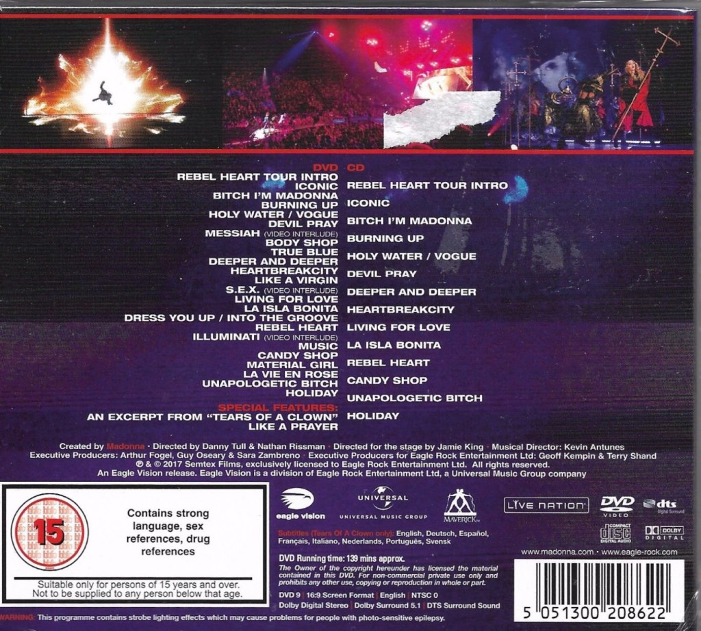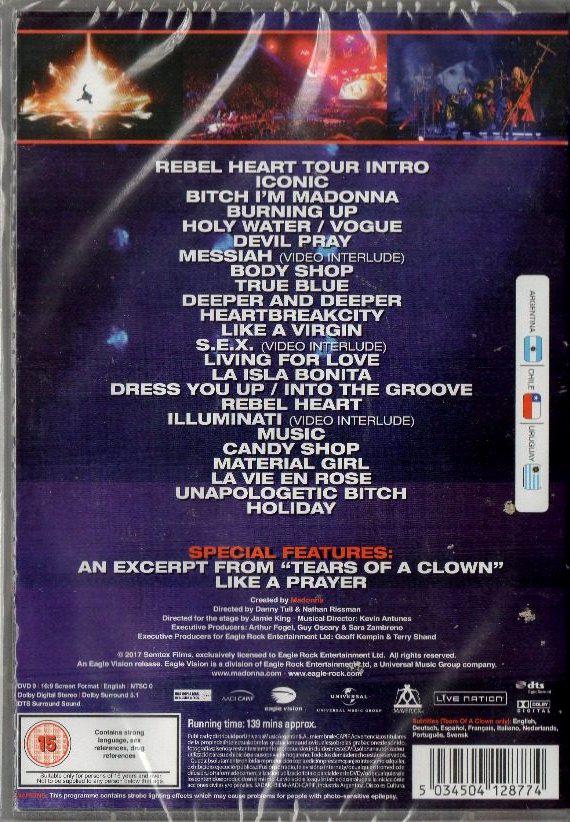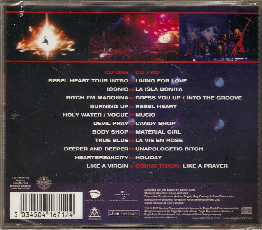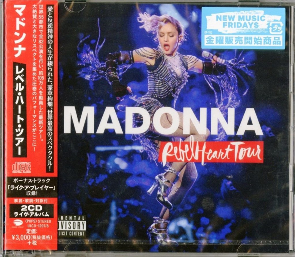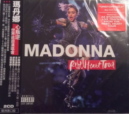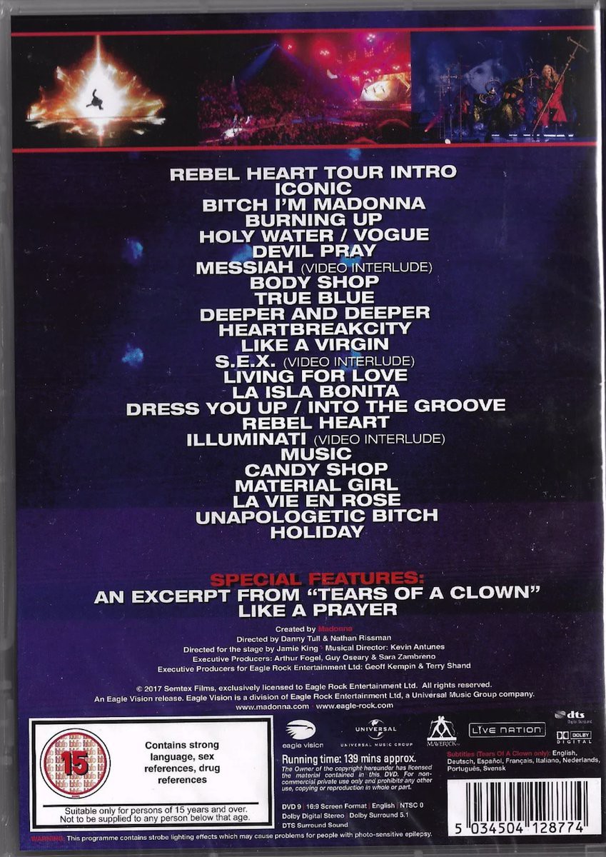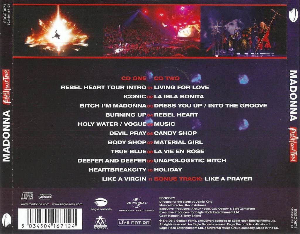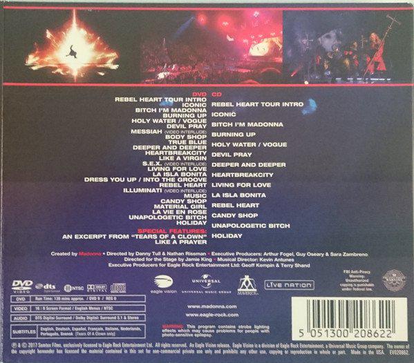 En 2017, «The Rebel Heart Tour» se lanzó en formato de audio con la versión del show completo en 2 CDs en empaque jewelcase doble. Y luego una edición de CD simple con selección de 14 tracks que venía conjuntamente en empaque digipack junto al DVD o al Blu-ray. Además, se lanzó una versión de solo video con disco DVD o Blu-ray. Por otro lado en 2022, se editó la versión en vinilo doble con la misma selección de 14 tracks que la versión CD single. Todas las imagenes pertenecen a Madonna Discography.