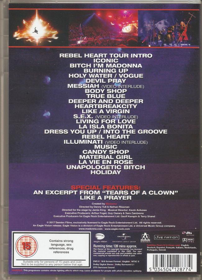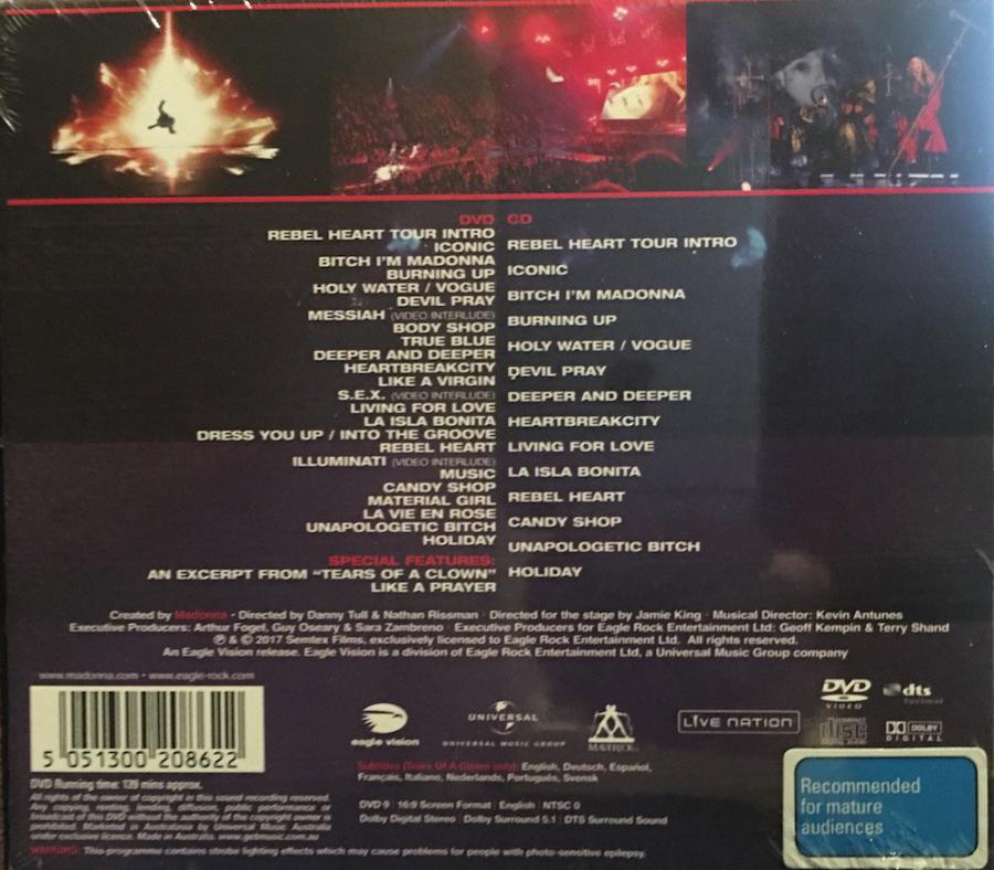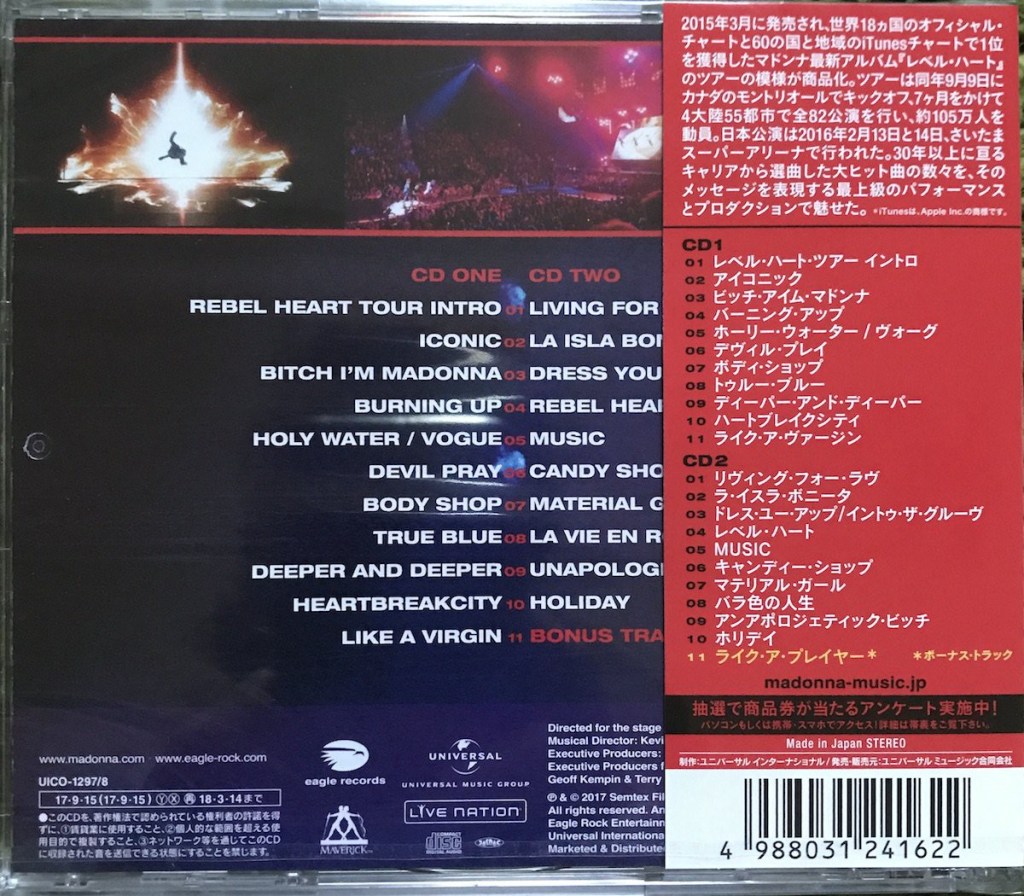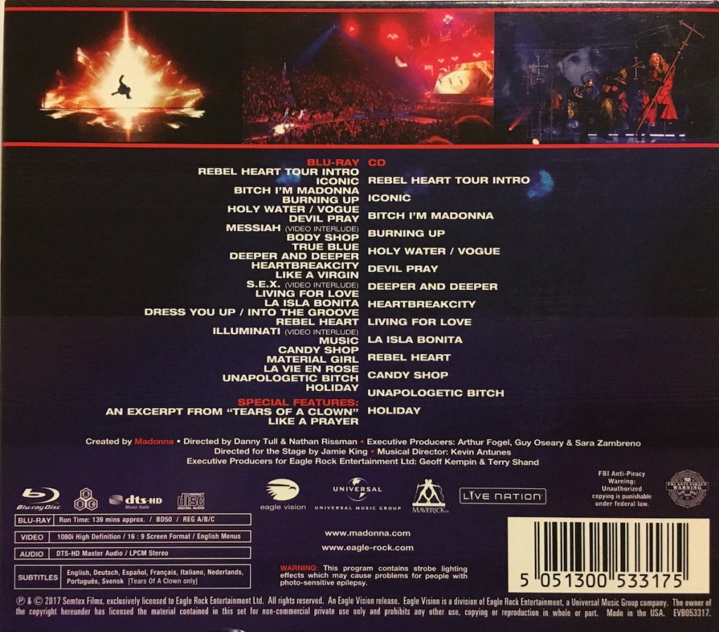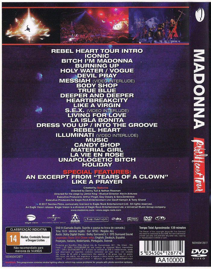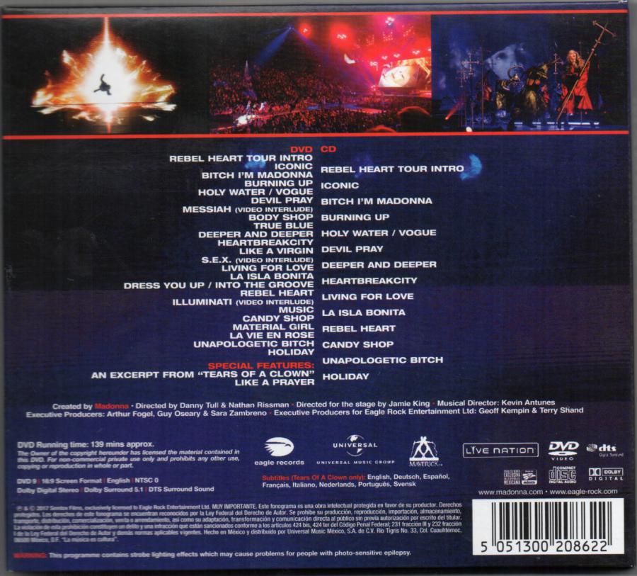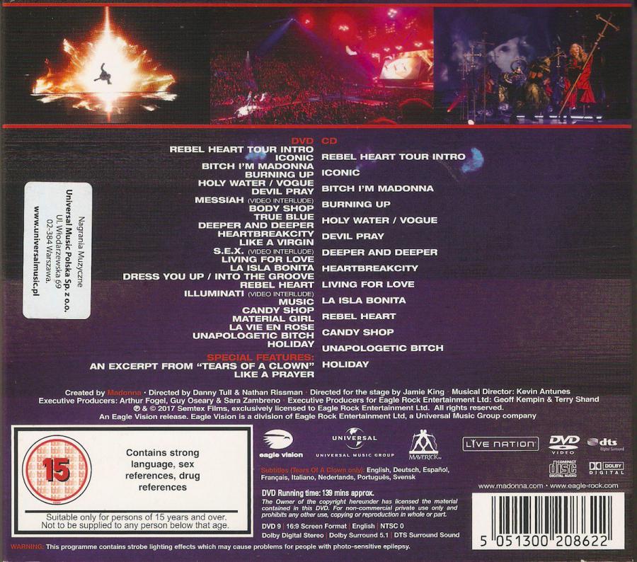 En 2017, «The Rebel Heart Tour» se lanzó en formato de audio con la versión del show completo en 2 CDs en empaque jewelcase doble. Y luego una edición de CD simple con selección de 14 tracks que venía conjuntamente en empaque digipack junto al DVD o al Blu-ray. Además, se lanzó una versión de solo video con disco DVD o Blu-ray. Por otro lado en 2022, se editó la versión en vinilo doble con la misma selección de 14 tracks que la versión CD single. Todas las imagenes pertenecen a Madonna Discography.