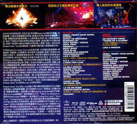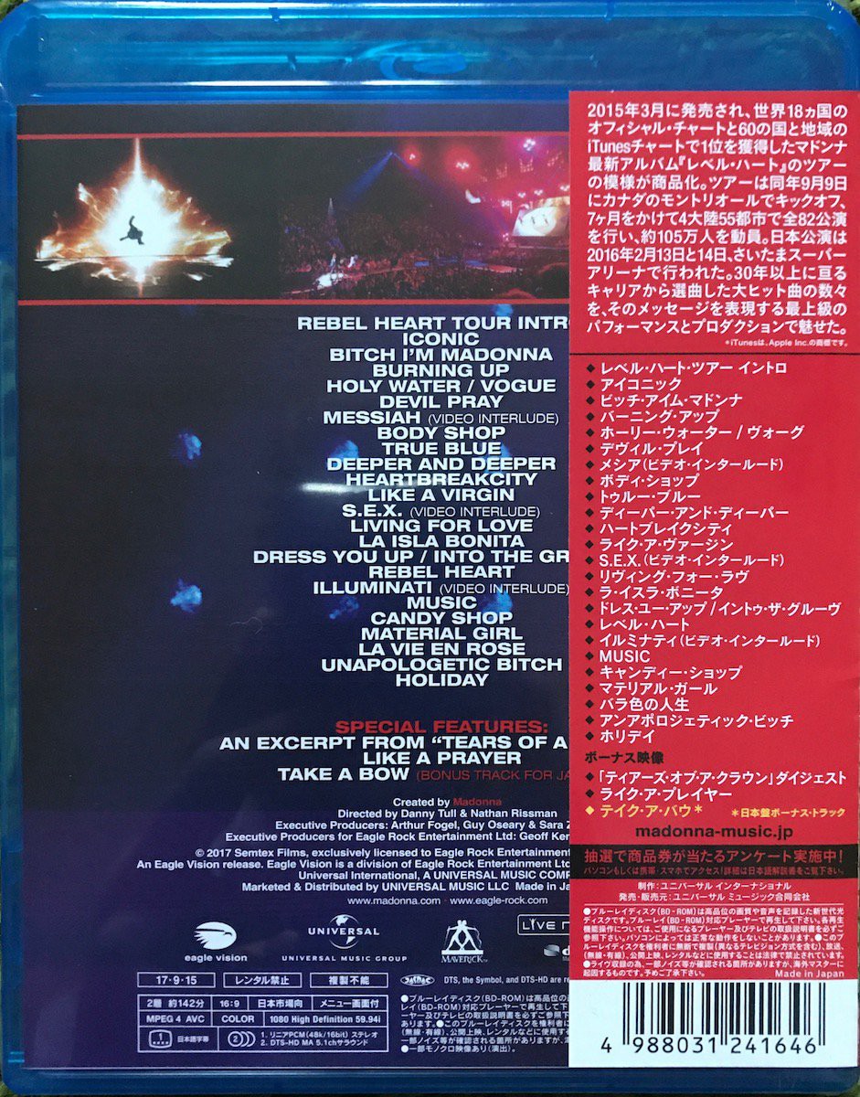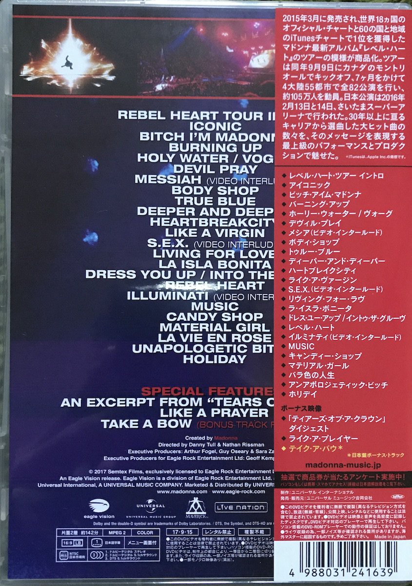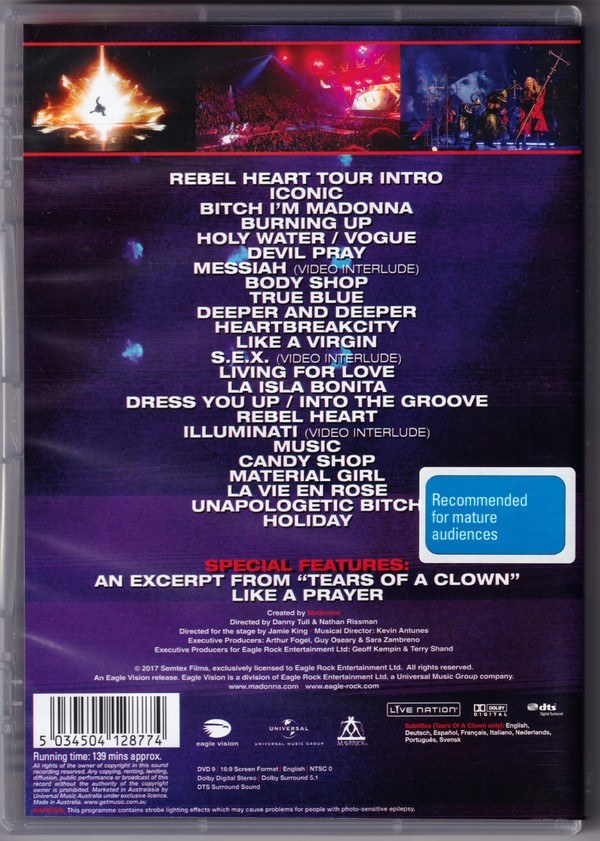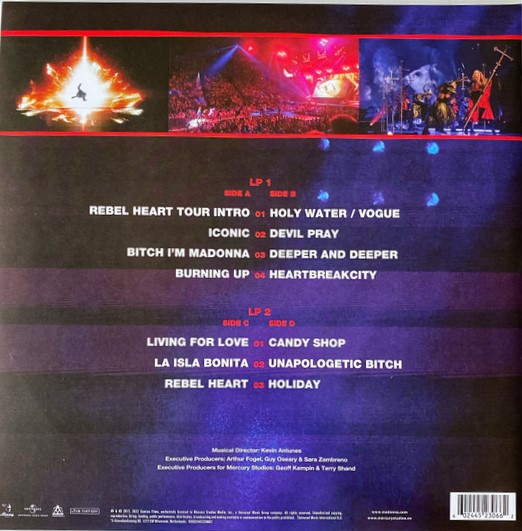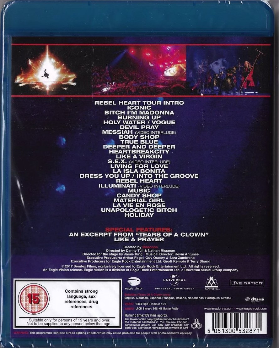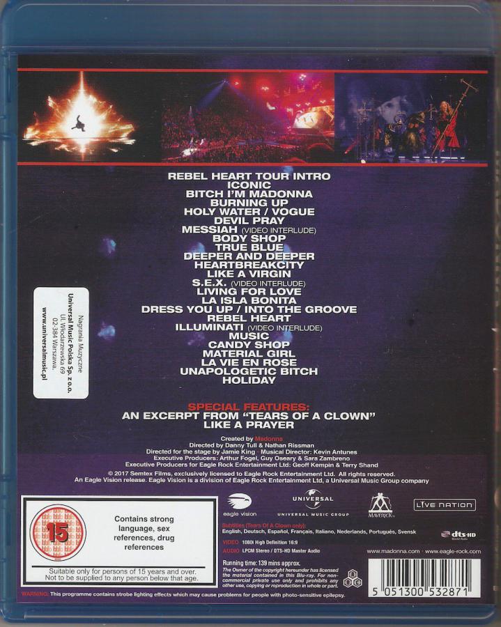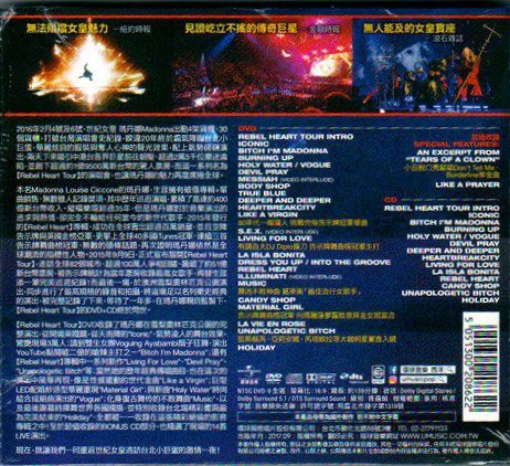 En 2017, «The Rebel Heart Tour» se lanzó en formato de audio con la versión del show completo en 2 CDs en empaque jewelcase doble. Y luego una edición de CD simple con selección de 14 tracks que venía conjuntamente en empaque digipack junto al DVD o al Blu-ray. Además, se lanzó una versión de solo video con disco DVD o Blu-ray. Por otro lado en 2022, se editó la versión en vinilo doble con la misma selección de 14 tracks que la versión CD single. Todas las imagenes pertenecen a Madonna Discography.