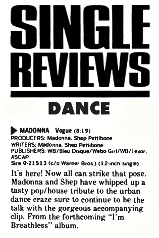 ¿SABÍAS QUE? En 1990 Sire Records habilitó el número de noticias 1-900-98-VOGUE (por cierto,ya está fuera de servicio) dedicado a Madonna, a un costo de USD 2 por el primer minuto y USD 1 dólar por cada minuto extra. Al llamar, uno escuchaba la sensual voz pre-grabada de Madonna saludando y agradeciendo por llamar, y luego se podían oir noticias acerca de «I’m Breathless»,»Dick Tracy» y «Blond Ambition».