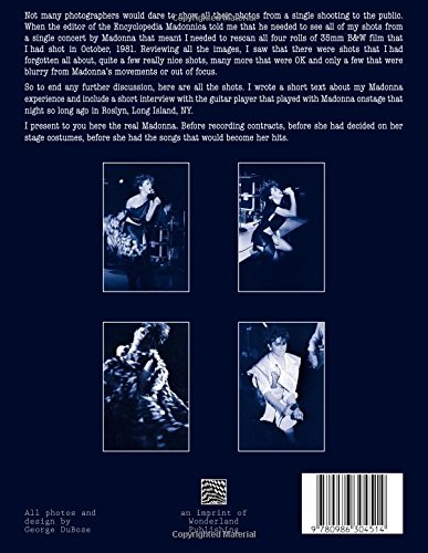 - Esto refiere el autor: «No muchos fotógrafos se atreverían a mostrar todas sus fotografías de una sesión completo al público, pero cuando el editor de “Enciclopedia Madonnica” me dijo que necesitaba ver todas las fotos que había tomado de una actuación de Madonna, significó que tuve que rescatar los cuatro rollos completos de film 35mm en blanco y negro que había tomado aquel octubre de 1981. Revisando las imágenes me di cuenta de que algunas había olvidado por completo; algunas son muy lindas fotos, otras adecuadas y algunas pocas fuera de foco o borrosa debido a los movimientos de Madonna. Así que para terminar todo tipo de discusión , aquí están todas las fotos. Escribí un pequeño texto acerca de mi experiencia de trabajar con Madonna e incluí una breve entrevista al guitarrista de la banda de aquella noche en Long Island. Les presento a ustedes aquí la verdadera Madonna. Antes de firmar contratos, antes de decidir su vestuario sobre el escenario; antes de que sus canciones se convirtieran en hits».