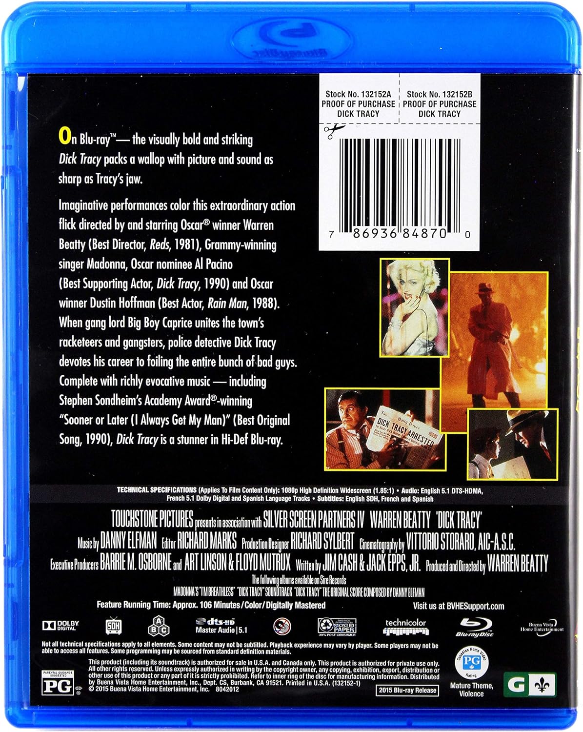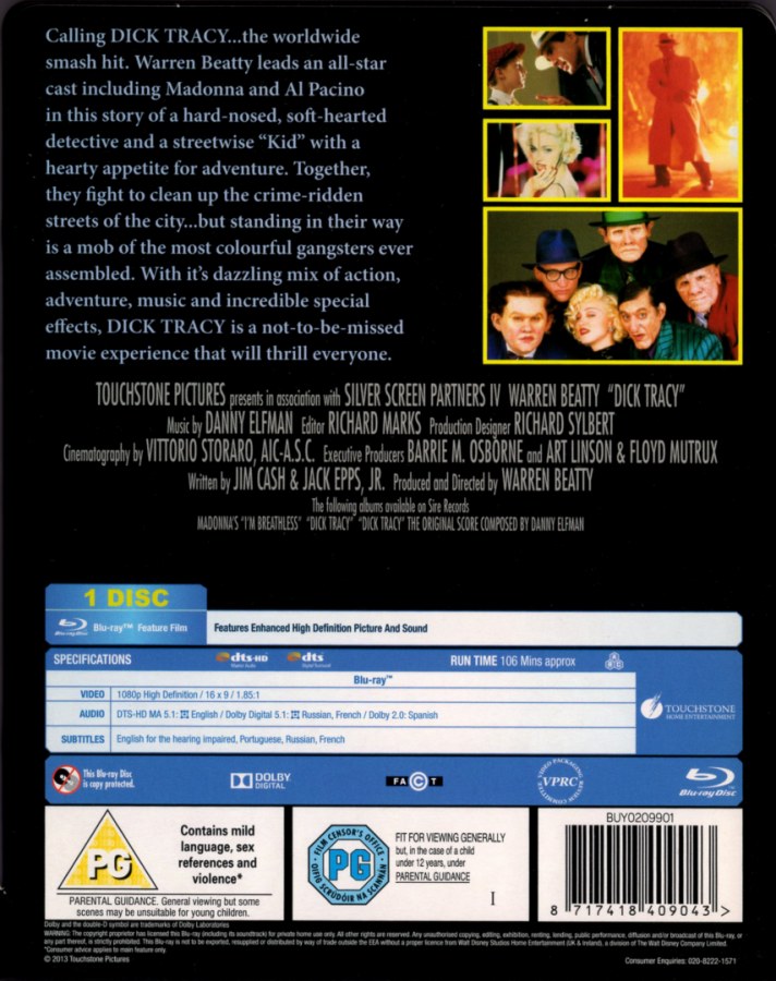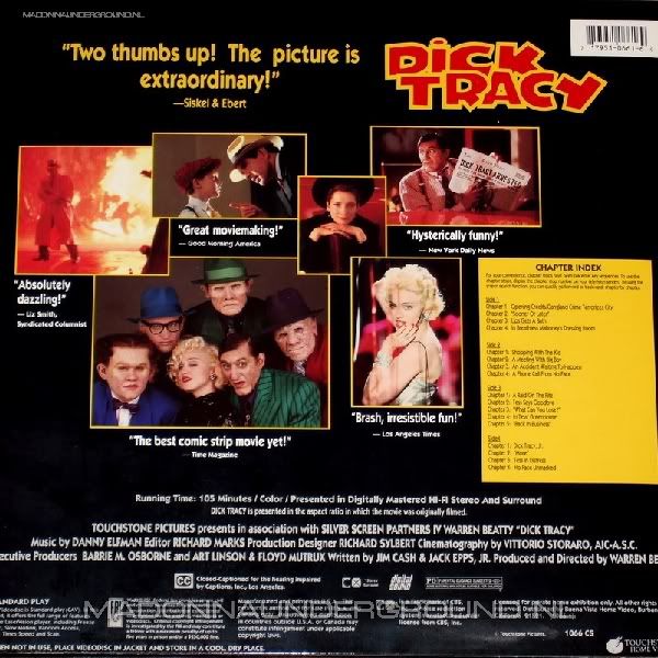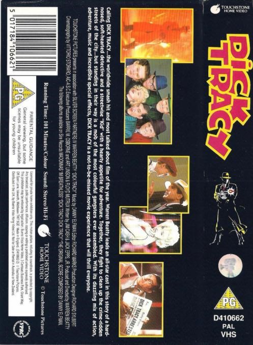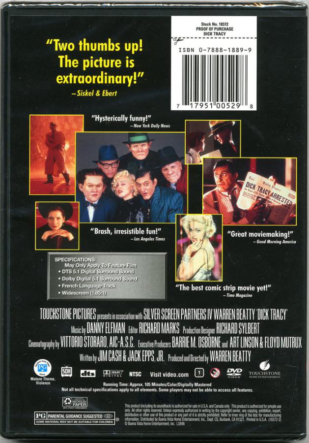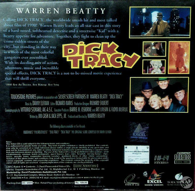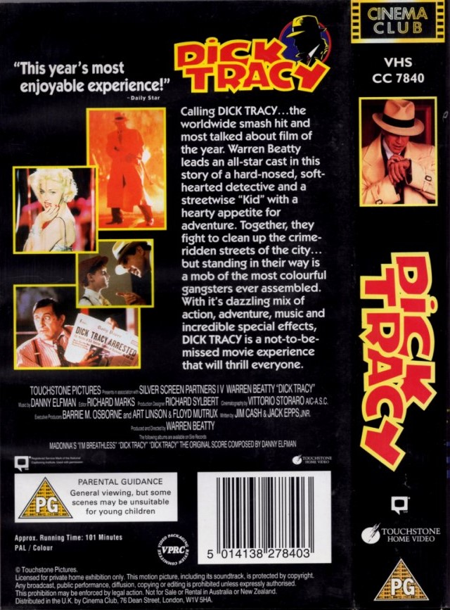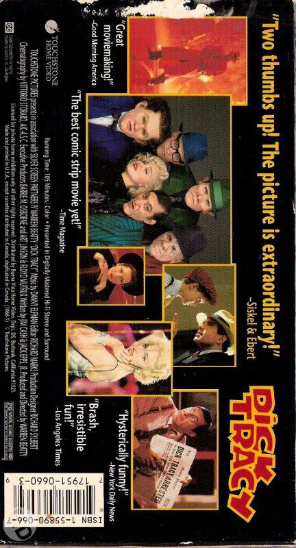 “Dick Tracy” se lanzó como VHS el 19 de diciembre de 1990 en USA, en todos los países de Europa y Japón, también tuvo un lanzamiento en tape-8 (sólo en USA). Ese mismo año se lanzó en formato Láser Disc tanto en Estados Unidos como Japón y en India se editó como VCD. En el 2000 se lanzó en formato DVD en Europa mientras que en USA se editó recién en 2002; en ninguno de los casos se agregó material extra. El formato blu-ray se puso a la venta en diciembre de 2012 en USA, UK y Japón, tampoco cuenta con material adicional. El arte y diseño es exactamente el mismo para todos los países en donde se editó el film, salvo con algunas mínimas variaciones según el país. Todas las imagenes pertenecen a Madonna Discography.