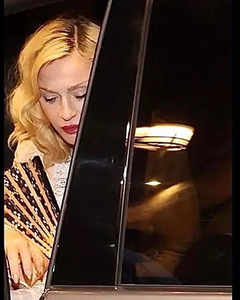 Por la noche, Madonna realizó una celebración privada (¿será la primera de muchas como todos los años?) en el «Grand Hotel Continental Siena», un exclusivo hotel 5 estrellas ubicado en el centro de la ciudad. Se mostró radiante con un vestido blanco abierto en la parte delantera, un corset de encaje en color natural y un tapado largo de seda en color beige. Infaltable: su abanico de seda «Gucci».