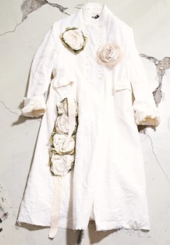 - Tapado largo de seda en color champagne con apliques de broches de flores de la diseñadora Elena Dawson.