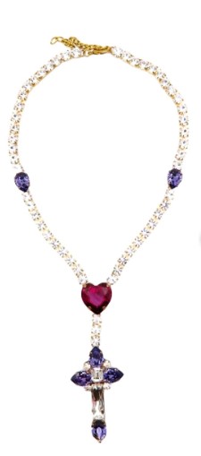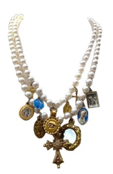 - Collares en pedrería con cristales y cruz violeta y corazón fucsia y doble collar de perlas con multiples dijes en oro con estampas religiosas de Antichita Petrone.