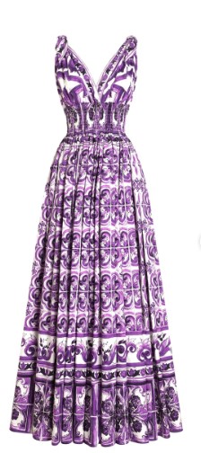 - Vestido largo sin mangas en poplin con estampado de «majolica» en color violeta de la última colección de «Dolce & Gabbana».
