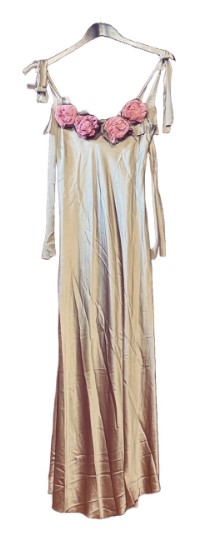 - Vestido largo de seda en color champagne strapless con apliques de flores en tela de Elena Dawson.
