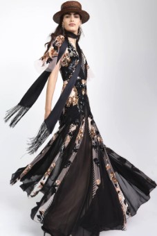 - Vestido largo con mangas con volados en gasa color negro, bordado con lentejuelas en dorado y transparencias modelo «Gilded Gown» de la colección primavera-verano 2026 de la firma «Temperley London».