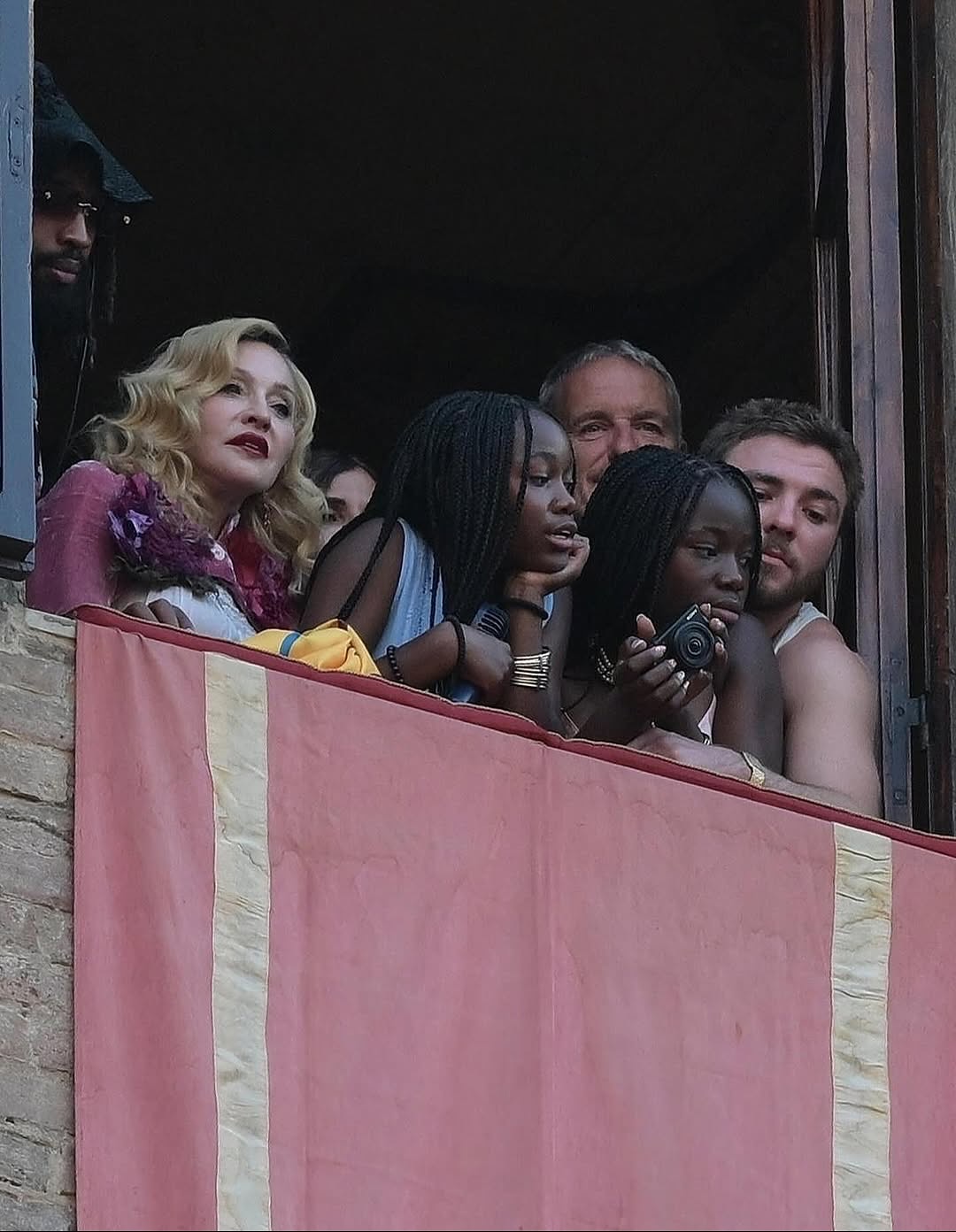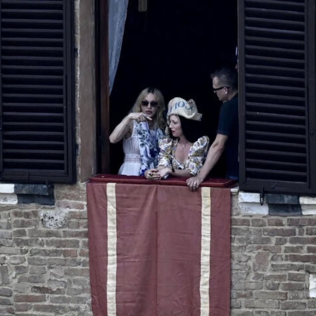 Más tarde, Madonna y toda su familia se reunieron en esa misma ventana para disfrutar de unas vistas privilegiadas de la famosa «Celebración del Palio», llevada a cabo en esa misma plaza. El «Palio de Siena» («Palio di Siena») es una carrera de caballos de origen medieval, que enfrenta a los distritos de la ciudad de Siena. Esta competición se desarrolla dos veces al año: el 2 de julio, cuando se corre el «Palio di Provenzano» (en honor a la Virgen de Provenzano) y, justamente, el 16 de agosto con el «Palio dell’Assunta» (en honor de la Asunción de la Virgen). Desde la ventana del «Palazzo Pannocchieschi d’Elci», Madonna presenció la carrera con completo interés acompañada de algunos de sus hijos.