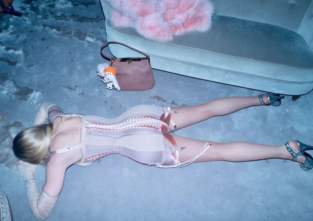 - Corset con bustier y portaligas acordonado al frente en seda en color nude y rosa pálido de la colección Primavera-Verano 2024 de la firma «Dolce & Gabbana». Recordemos que esta pieza ya fue usada durante una sesión de fotos en la villa Portofino de Dolce & Gabbana mientras Madonna celebraba su cumpleaños en Italia en agosto de 2024.