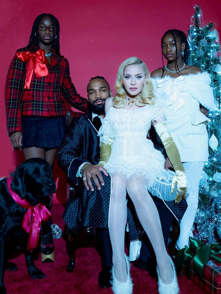 En otra sesión un poco más «angelical», vemos a Madonna vestida completamente de blanco desde los tacones hasta los guantes largos de ópera de seda en color marfil. Su novio, esta vez de bata de seda en color negro, adorna el árbol de navidad mientras ella juega en el piso con gigantescas bolas de espejo, lo cual es un guiño directo a su próximo disco que será lanzado a comienzos de 2026 como la continuación de «Confessions on a Dancelfloor». Para algunas de estas fotos se sumaron además, sus hijas las gemelas Estere y Stella.
