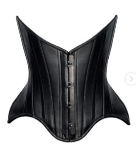 - Corset corto con armazón en «V» en cuero nebro y con broches delanteros modelo «Celia» de la casa «Corsetorium».