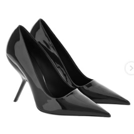 - Zapatos de charol negro con taco oblicuo de «Ferragamo».
