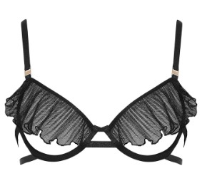 - Sobre el anterior, otro sujetador con armazón de alambre semi abierto con vuelos de gasa plisados modelo «Bluebella» de «Victoria’s Secret».