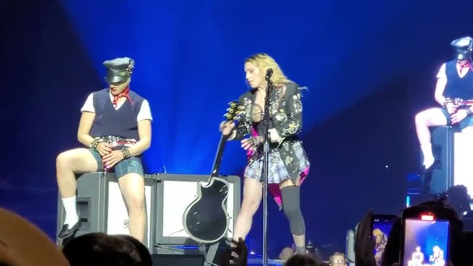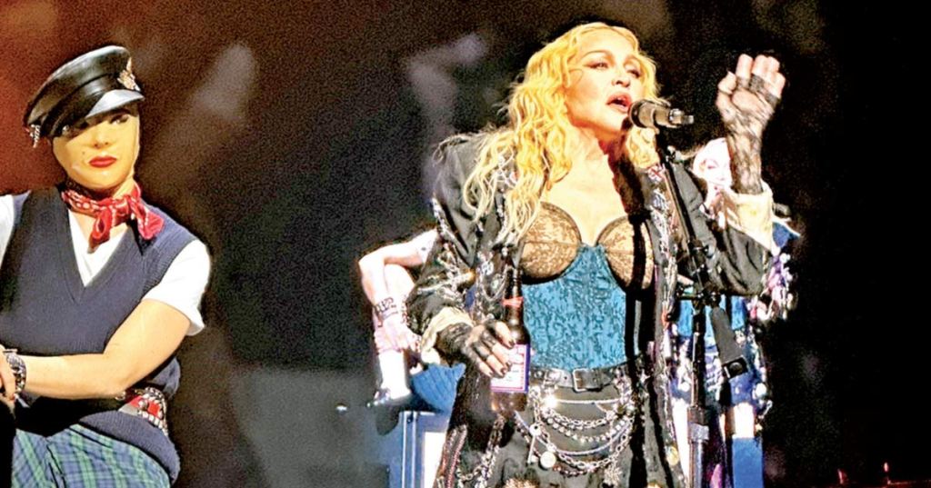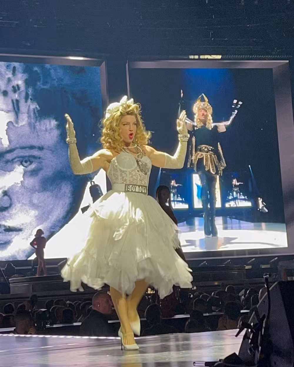 Pero antes del gran final con la canción «Bitch I’m Madonna», Madonna se encontró con ella misma en varias oportunidades. Para empezar, el show abre con la presencia de Bob The Drag Queen encarnando a aquella Madonna en el rol de Maria Antonieta de los Premios MTV de 1990. Bob hace un monólogo de apertura y funciona como maestro de ceremonia para dar inicio a este viaje visual. Bob juega con el público para calentar el ambiente anticipando la llegada de Madonna. Fue una jugada más que bien hecha, Bob con una contextura física antagónica con Madonna lo mismo sirvió de espejo para dar comienzo a esta aventura. La imagen elegida no fue el azar, el vestuario de Maria Antonieta de 1990 en el que Madonna interpretó nada menos que «Vogue» quedó grabado en la memoria de fans y de todo el mundo como uno de los atuendos más icónicos y representativos. Abrir este show plagado de recuerdos y nostalgia con este vestido fue un sello que marcó desde el primer minuto la esencia del show. Bob volvió a salir con este atuendo durante el gran final del show junto con el resto de los bailarines.