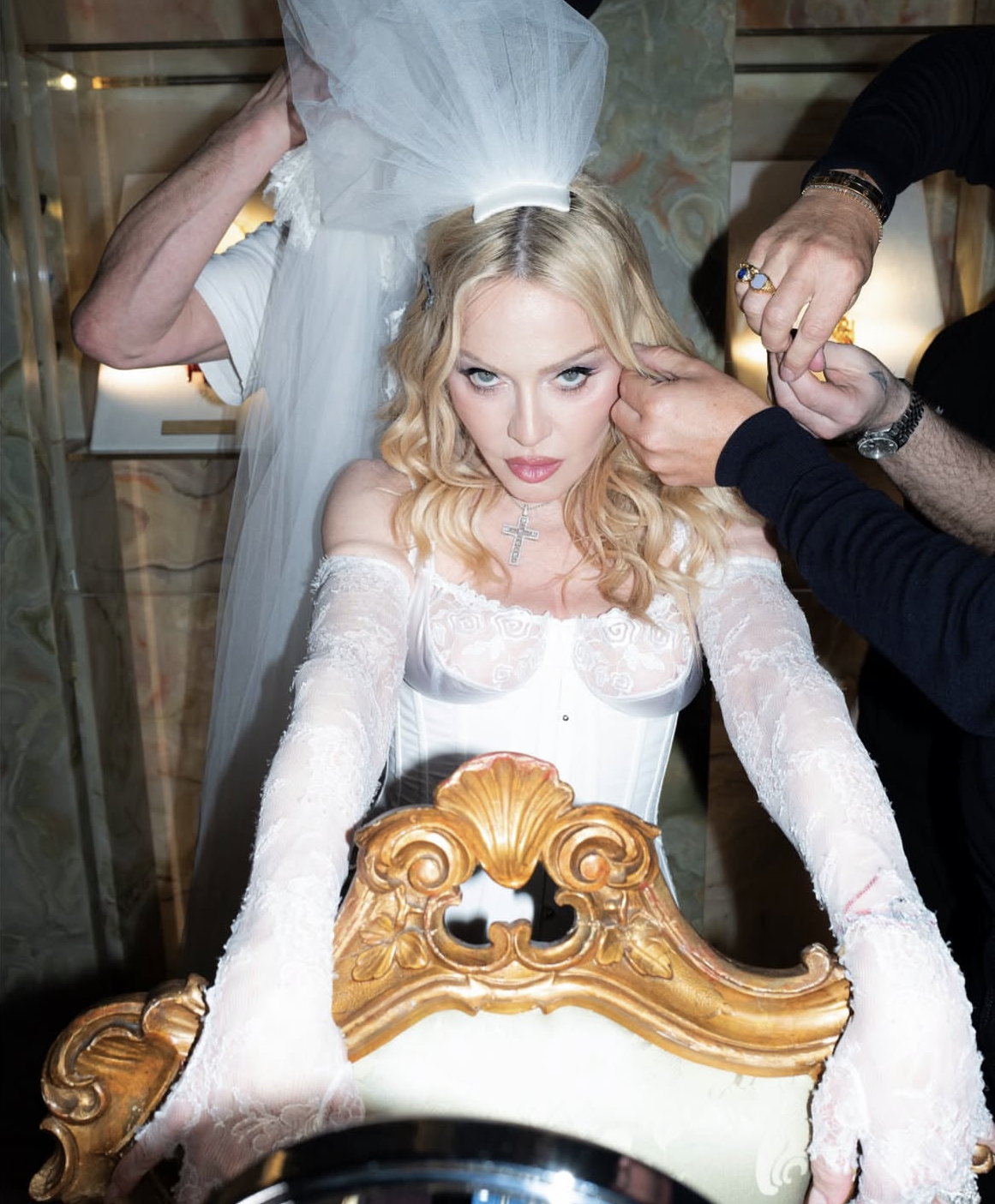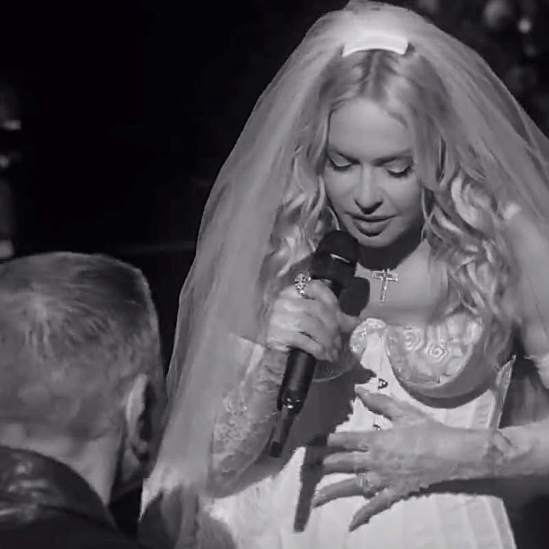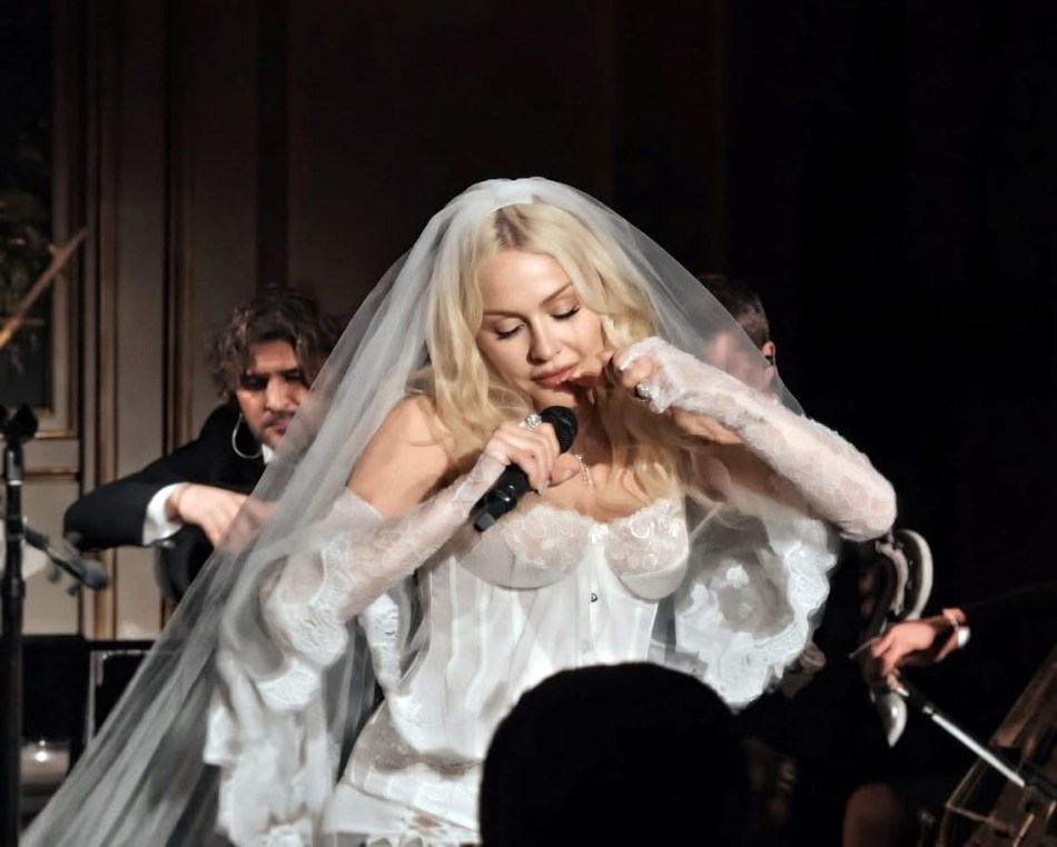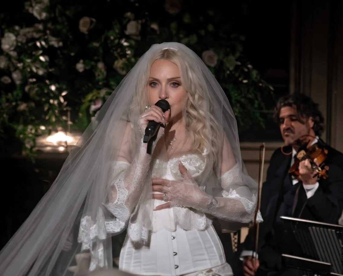 En un determinado momento, la noche se transformó en una experiencia casi cinematográfica cuando la Reina del Pop tomó el centro del salón para ofrecer una actuación íntima y absolutamente inédita. Vestida con un impactante conjunto blanco con corset estructurado, mini short y un delicado velo de novia que cubría su rostros y sus hombros, Madonna combinó sensualidad y teatralidad con una elegancia casi ritual. La atmósfera del palacio, iluminada por candelabros y rodeada de frescos clásicos, parecía diseñada para el momento que estaba por ocurrir. La sorpresa mayor llegó cuando la artista interpretó por primera vez en vivo “La Bambola”, la célebre canción italiana que ha atravesado generaciones y que sirvió de eje fundamental para la camapaña publicitaria de la última fragancia «The One» de la firma del dúo de diseñadores italianos.