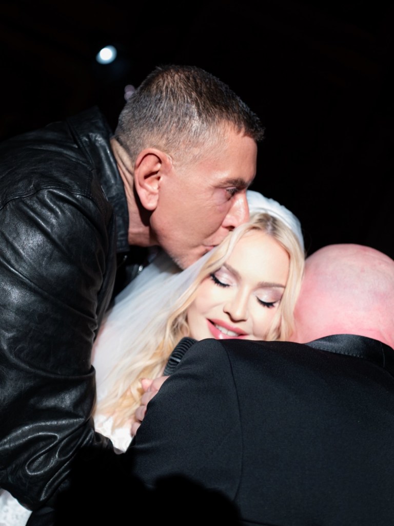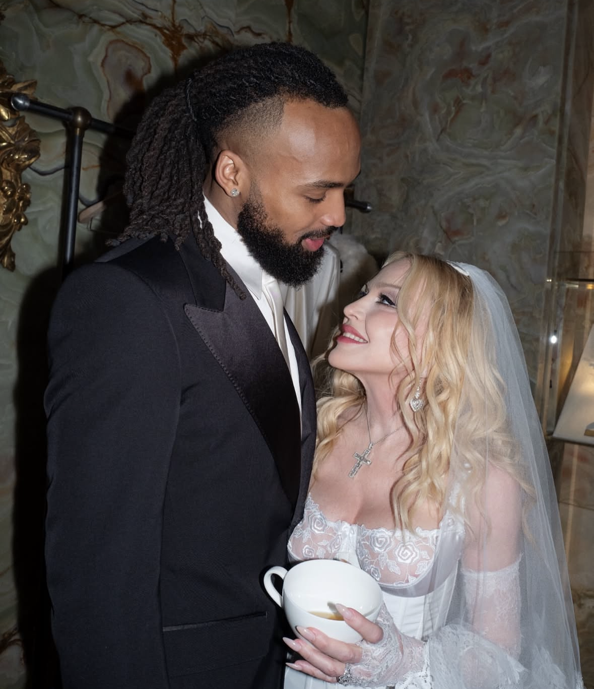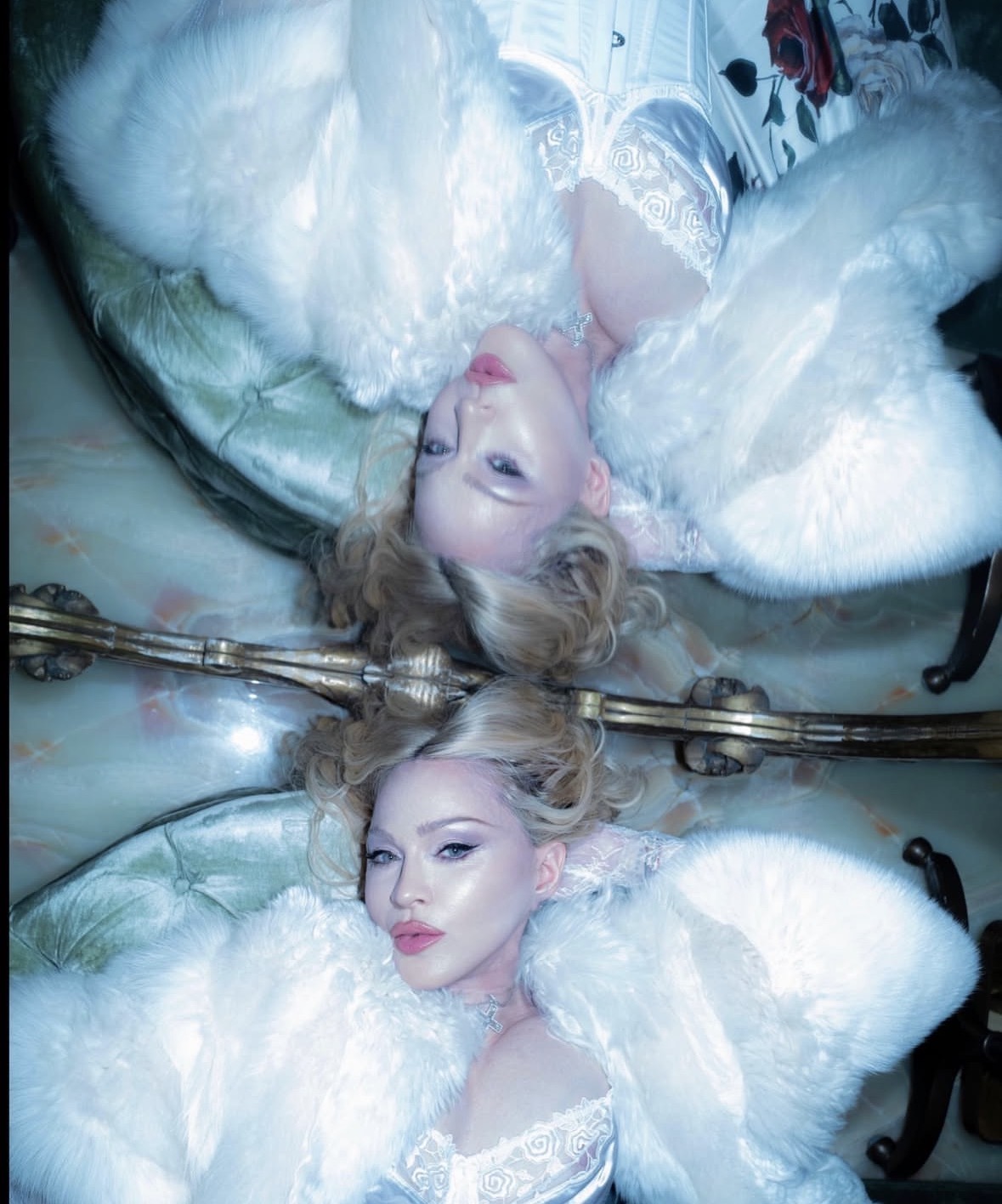 En un determinado momento, la noche se transformó en una experiencia casi cinematográfica cuando la Reina del Pop tomó el centro del salón para ofrecer una actuación íntima y absolutamente inédita. Vestida con un impactante conjunto blanco con corset estructurado, mini short y un delicado velo de novia que cubría su rostros y sus hombros, Madonna combinó sensualidad y teatralidad con una elegancia casi ritual. La atmósfera del palacio, iluminada por candelabros y rodeada de frescos clásicos, parecía diseñada para el momento que estaba por ocurrir. La sorpresa mayor llegó cuando la artista interpretó por primera vez en vivo “La Bambola”, la célebre canción italiana que ha atravesado generaciones y que sirvió de eje fundamental para la camapaña publicitaria de la última fragancia «The One» de la firma del dúo de diseñadores italianos.