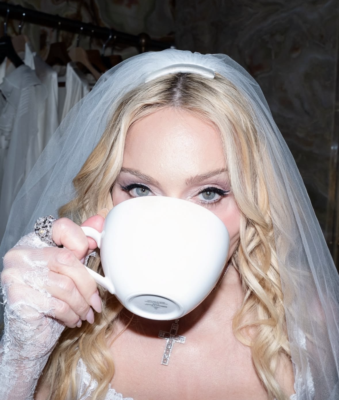 Detalle del estilo de Madonna enfundada de pies a cabeza por «Dolce & Gabbana» todo en blanco para interpretar «La Bambola».