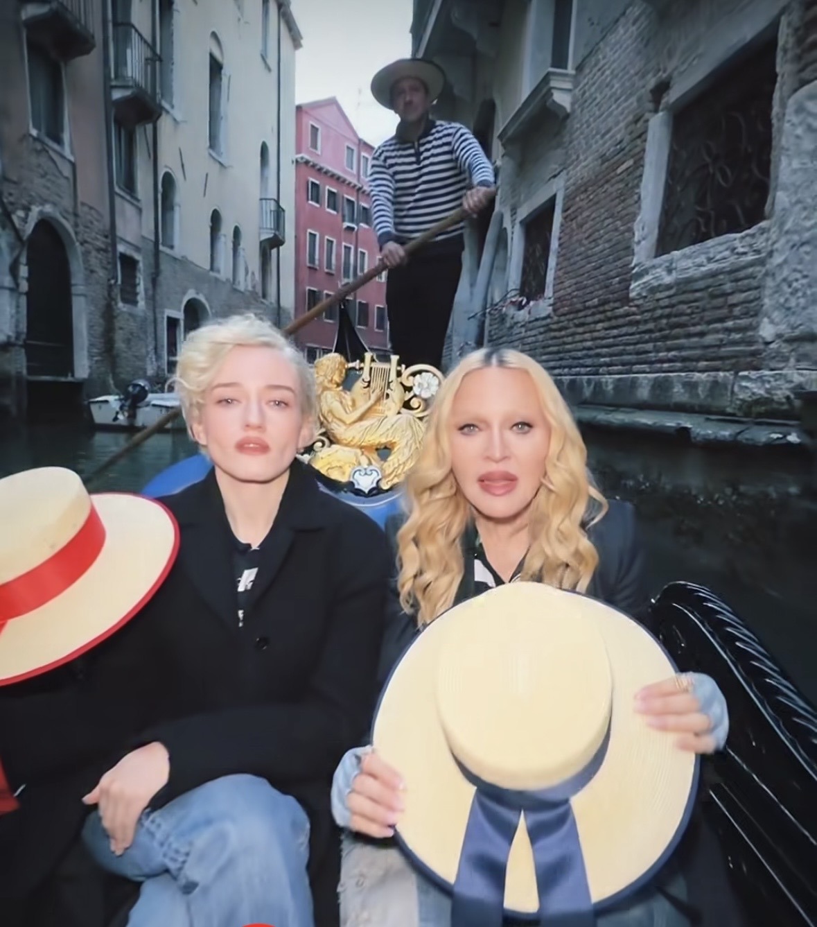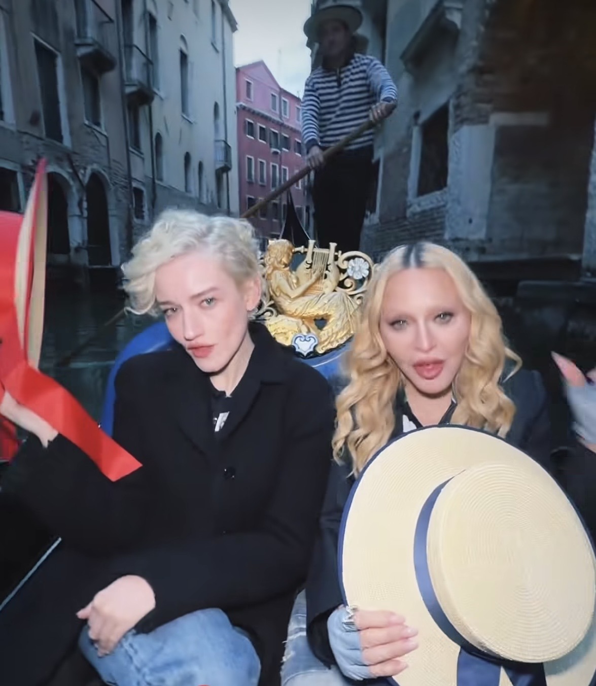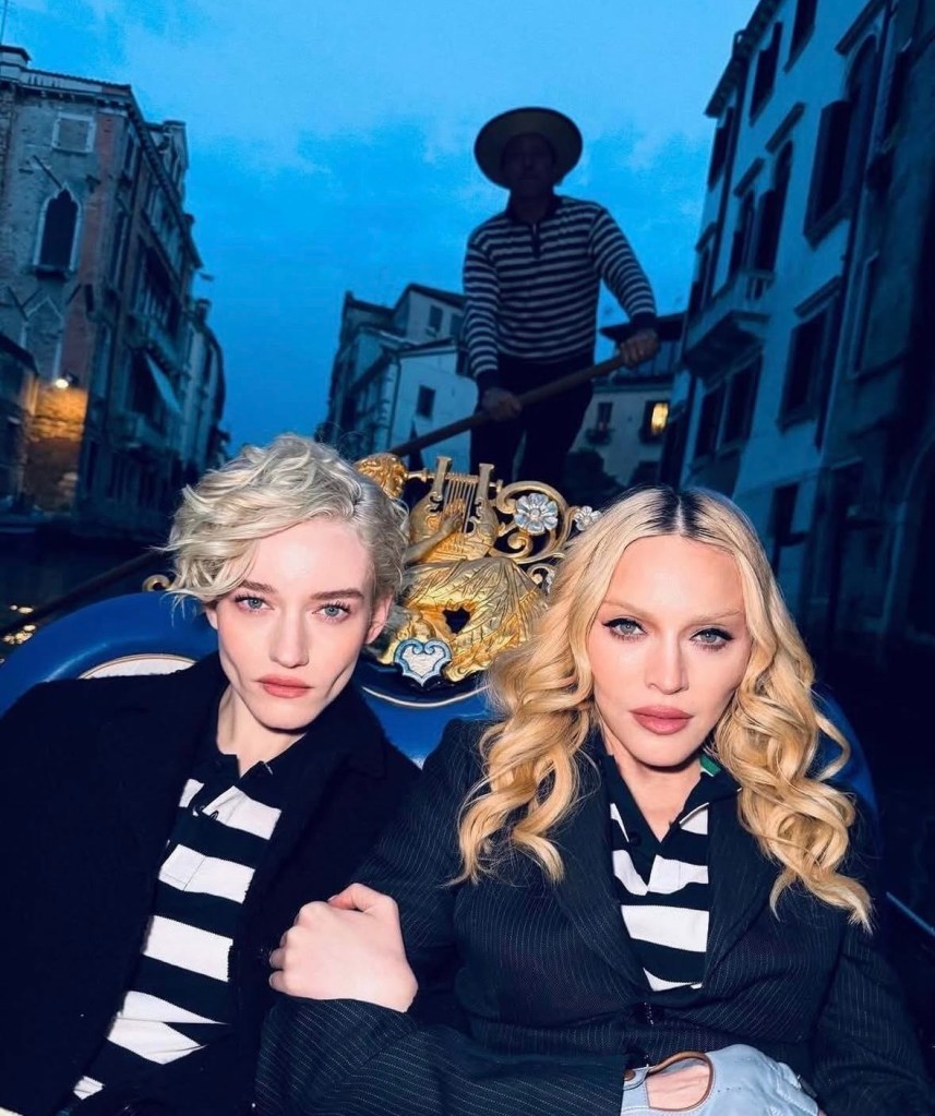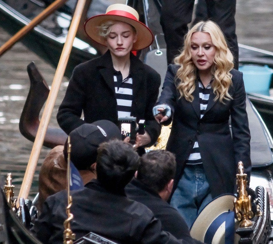 Hay imágenes que no envejecen y se transforman en mito. Y pocas son tan icónicas como Madonna deslizándose por los canales de Venecia en el video «Like a Virgin», allá por 1984. Cuatro décadas después, ese gesto vuelve a cobrar vida, pero con un giro inesperado: esta vez, la acompaña Julia Garner. Ambas artistas ataviadas con sombreros y top a rayas típicos de la ciudad recorrieron el rio Menúa, pasando por el «Ponte de la Malvasia» en la calle del mismo nombre llegando al «Ponte Minich». Mientras la góndola avanza lenta, el agua refleja fachadas gastadas por siglos de historia las mismas fachadas que vieron a aquella joven Madonna cantanto y bailando descaradamente hace poco más de cuarenta años atrás. Esta vez, Madonna, consciente de su propio legado, retoma la interpretación con una mezcla de ironía y maestría. Ya no es la joven que provocaba al mundo; es la artista que sabe exactamente cómo hacerlo. A su lado, Julia Garner no imita: interpreta. Su presencia dialoga con aquella Madonna original que cantaba entre encajes, deseo y desafío.