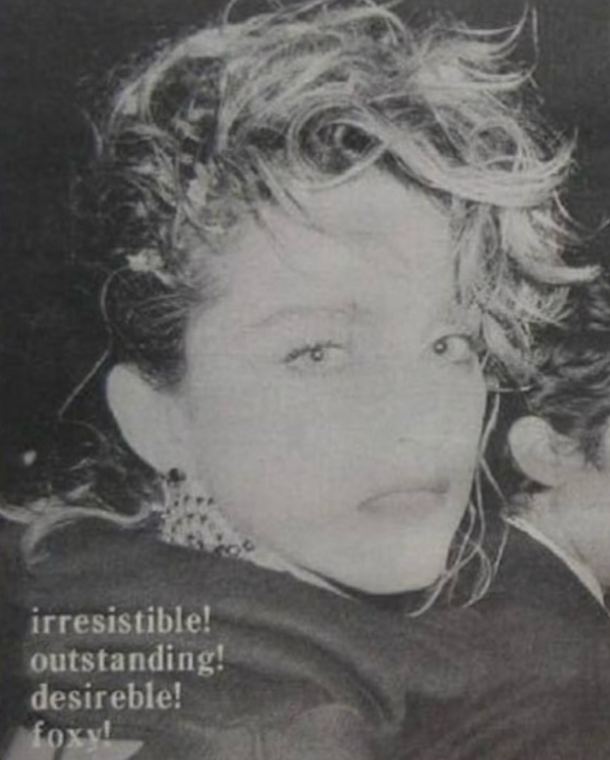 Fotografida por Vinnie Zuffante, Madonna aparece en un evento hasta hoy desconocido. No se sabe la fecha exacta ni el lugar, se cree que es entre septiembre y noviembre de 1984. Por el estilo del peinado de Madonna, algunos piensan que es la after party de los «MTV VMA» que se realizó el 14 de septiembre en el restorán «Tavern on the Green»; otros piensan que es la fiesta de cierre de la filmación de «Desperately Seeking Susan» y una tercera hipótesis menciona que podría ser el cumpleaños de «Jellybean» Benitez. Madonna está acompañada ademas por Erica Belle y luce el mismo top cuello en V y la falda de Alfredo Viloria y Federico Mac-Quahae de la firma «La Coppia» que ya había usado durante la sesión de fotos de Scavullo para la revista «Harper;s Bazaar» de septiembre de 1984.