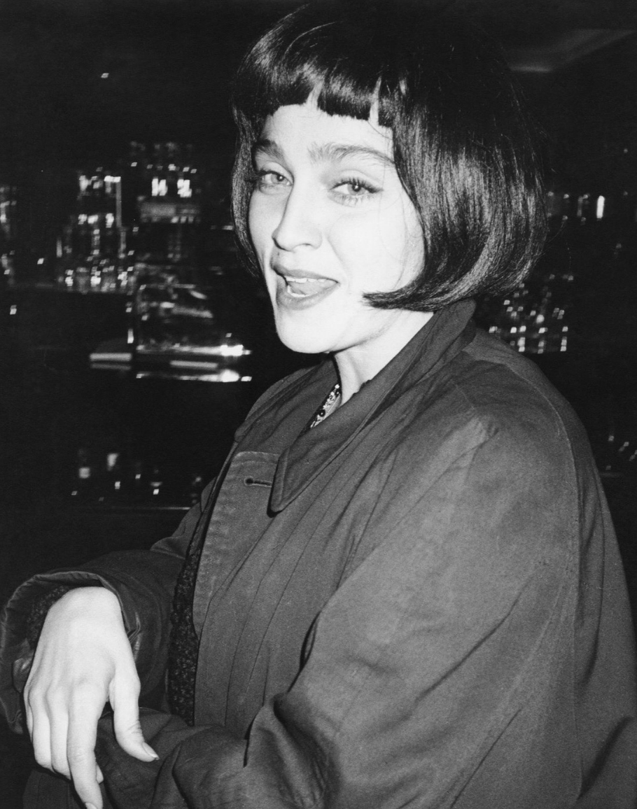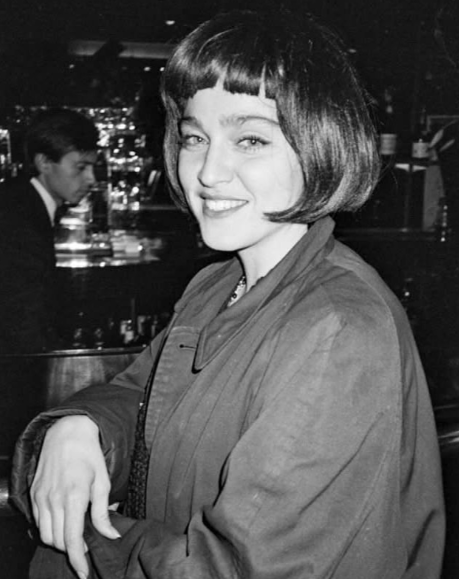 En estas raras fotografías tomadas ni más ni menos que por Andy Warhol vemos a Madonna luciendo una extraña peluca corta y oscura. Según se relatan en los diarios de Warhol, esa fue el 17 de noviembre de 1984 cuando ambos viajaron en taxi a Brooklin para ver las obras que Keith Haring estaba preparando para su nueva muestra y al terminar todos regresaron para cenar en el restorán «Mr.Chow’s»