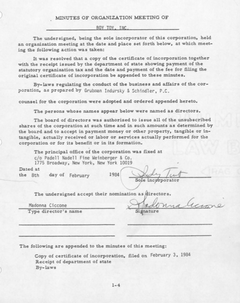 En plena era de MTV, donde la imagen era tan importante como la música, esta jugada fue visionaria. Madonna entendió antes que nadie que no era solo una cantante: era un producto cultural en expansión. «Boy Toy» Inc. no fue una mega corporación en términos estructurales, pero sí fue algo más importante: un cambio de mentalidad. Le permitió a Madonna negociar desde otro lugar, con mayor autonomía y una claridad brutal sobre su identidad artística. A partir de ahí, su carrera dejó de ser simplemente ascendente… y pasó a ser estratégicamente diseñada. El acuerdo de fideicomiso de participación en las ganancias de su empresa, fue originalmente redactado el 03 de febrero de 1984 y se finaliza con los documentos firmados el 28 de septiembre de 1984. El acuerdo de fideicomiso de participación en las ganancias, celebrado entre «Boy Toy», Inc., una corporación debidamente organizada y existente conforme a las leyes del Estado de Nueva York y Madonna Ciccone como fideicomisaria, entró en vigor retroactivamente el 03 de febrero de 1984, estableciendo directrices para asuntos financieros, incluyendo seguros, anualidades, inversiones y las facultades del consejo de administración. La empresa se creó para especializarse en videos musicales, películas y productos de merchandising de Madonna.