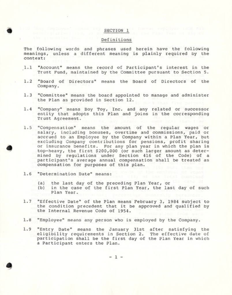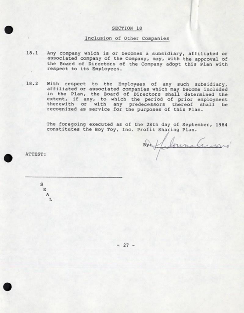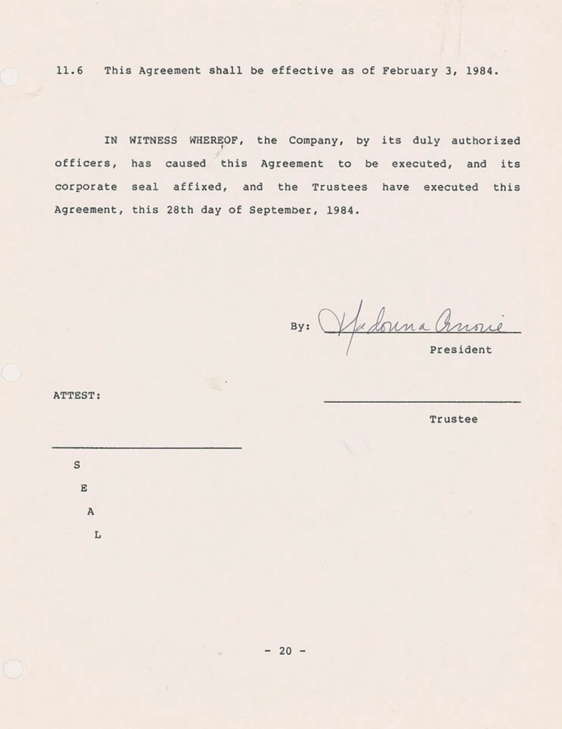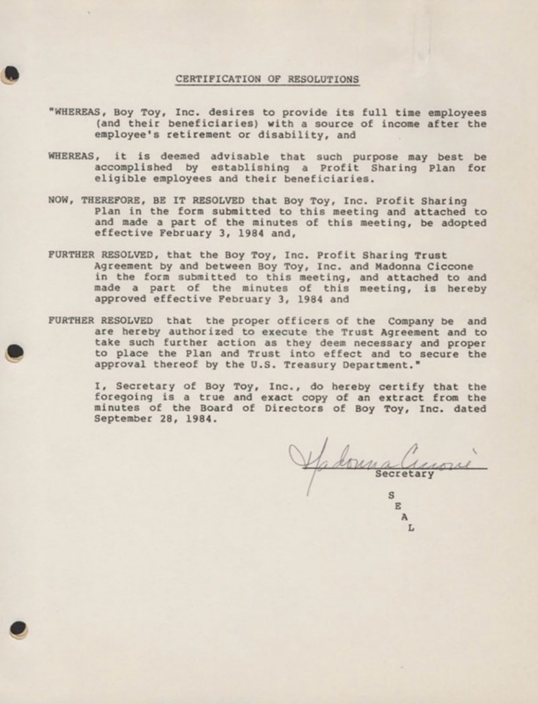 En las imagenes se incluye una copia de la sección 1 del documento, definiciones de la Compañía, el Certificado de Resolución y una copia firmada de la sección 18 del documento, Inclusión de Otras Compañías, Solicitud de determinación del plan de contribución definida con fecha del 28 de septiembre de 1984. Y, por último, una copia del acta de la reunión. La documentación completa, que consta de más de 50 páginas, fue subastada años después, en 2013 por U$S 2.701 por la casa «Gotta Have it Rock and Roll».