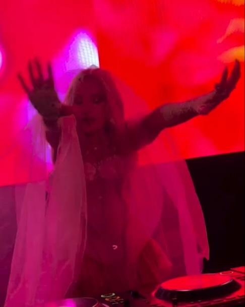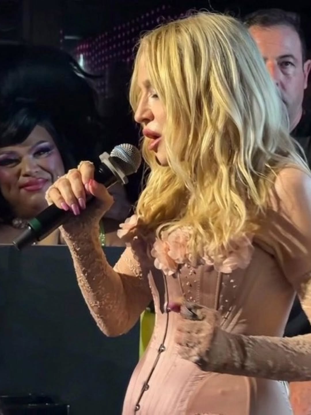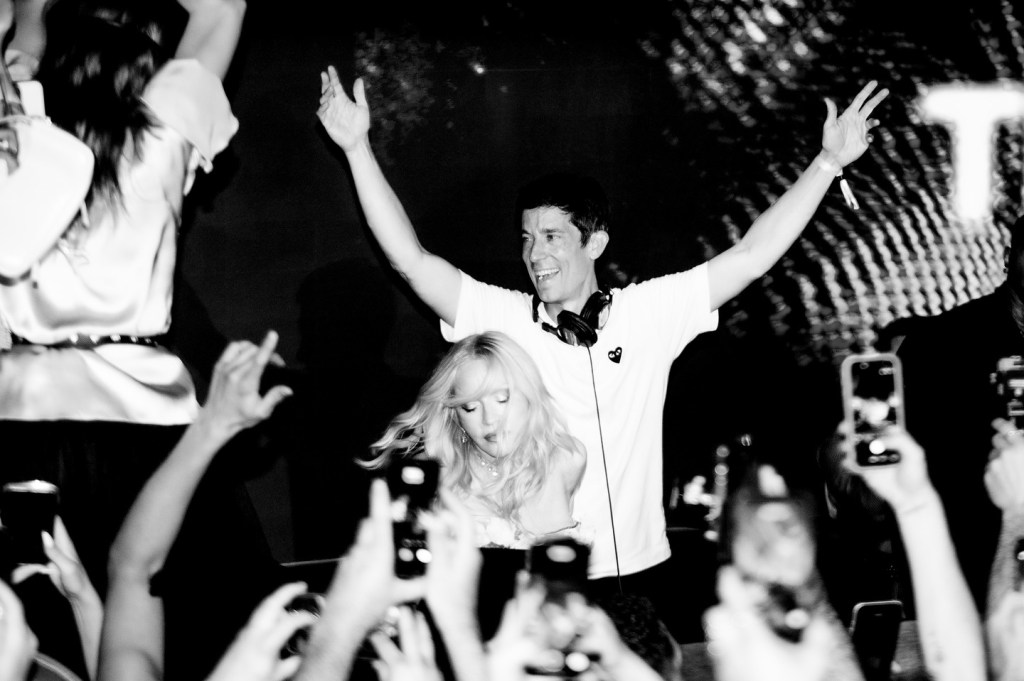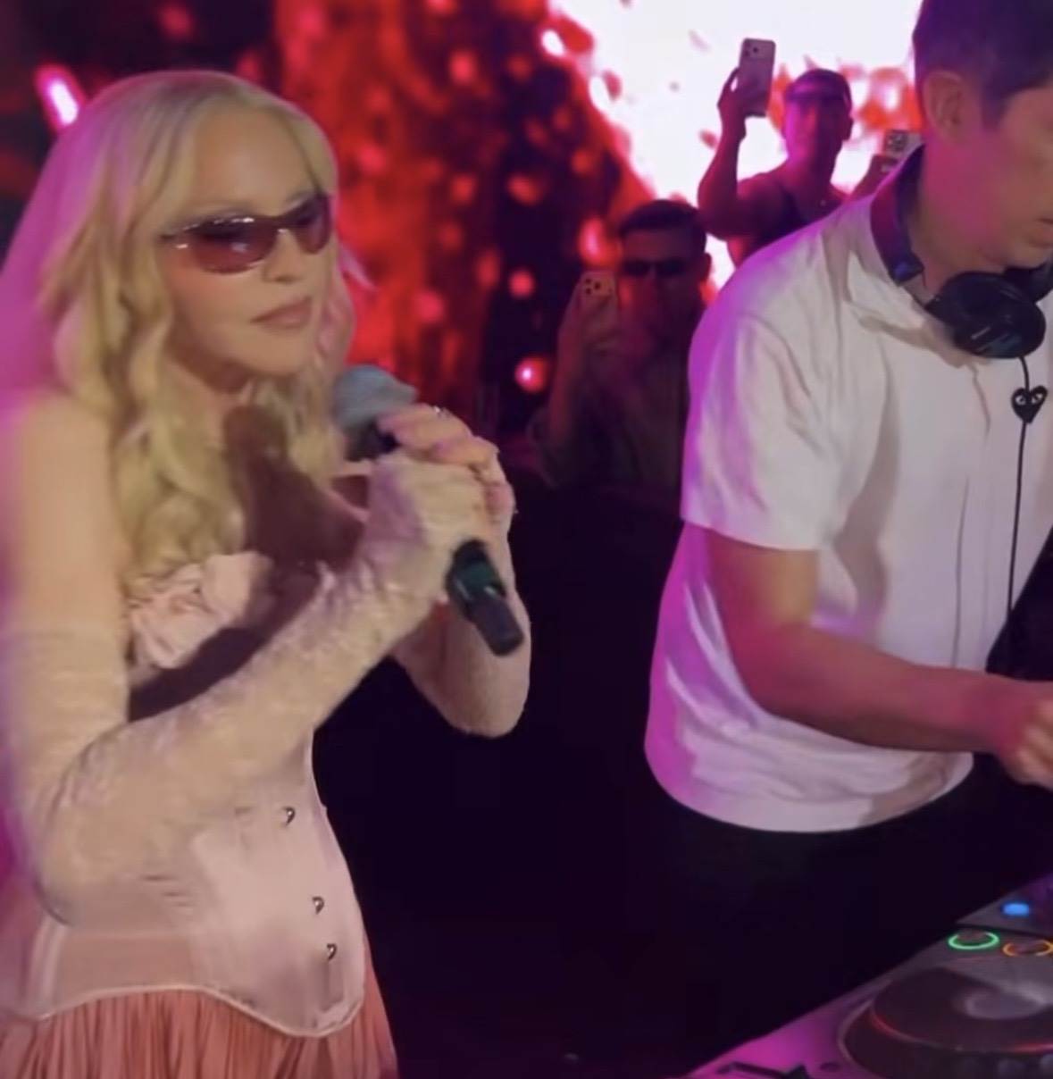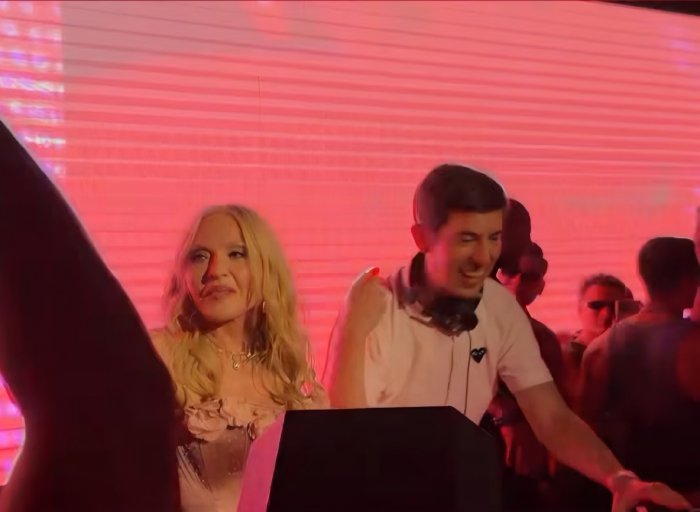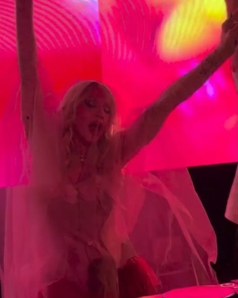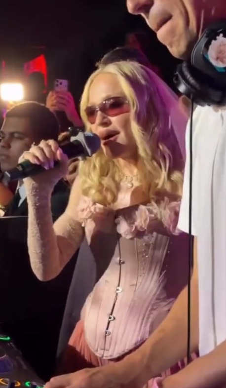 Entre la multitud se pudo ver a Lily Allen, Julia Fox, Kevin Huvane de CAA, las estrellas de «RuPaul’s Drag Race» Symone y Eureka, el exmarido de Britney Spears, Sam Asghari y Tori Spelling. A Madonna se le unieron en la cabina su novio futbolista y modelo, Akeem Morris, y su agente y amiga íntima Maha Dakhil. La pista de baile estaba llena de codo con codo con algunos fiesteros que se volvían demasiado agresivos, empujando a la gente mientras intentaban acercarse a la cabina del DJ lo que obligó a la seguridad del lugar a sacar a algunos participantes rebeldes. En un momento, Madonna deseó «feliz cumpleaños» a Schukraft, propietario de «The Abbey»; «¿Queremos bajarle los pantalones y azotarlo?» preguntó Madonna al público, aunque Schukraft se mantuvo completamente vestido mientras ella lo golpeaba juguetonamente en el trasero mientras le cantaban el «Feliz cumpleaños».