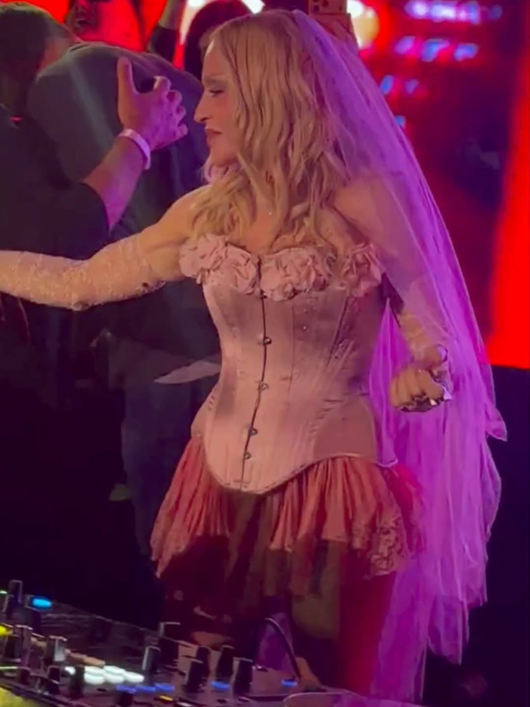 Y así fue, claramente, el evento fue realizado para seguir dando impulso al lanzamiento del nuevo disco, «Confessions II» y continuar con la gira de promoción que había iniciado a mediados de abril. Alrededor de la 1 a.m. Madonna llegó al lugar para desatar el descontrol, luciendo un ajustado corset rosa pálido con flores en el escote, minifalda de seda y encaje, botas altas y un velo de tul sobre su cabeza para emular la fantástica foto de portada de su nuevo disco, la Reina volvió a demostrar que sigue reinando en las pistas de baile. «Hola, niños, Mutha está aquí para salvarlos», dijo Madonna mientras se unía a Stuart Price en la cabina del DJ y continuó: «¿Estás listo para bailar para mí? Vamos, encuéntrame en la pista de baile. Muy bien, vamos gays, ¡vengamos! No me decepcionen, gays» y mientras ella bailaba, la multitud coreó, «Madonna», varias veces.